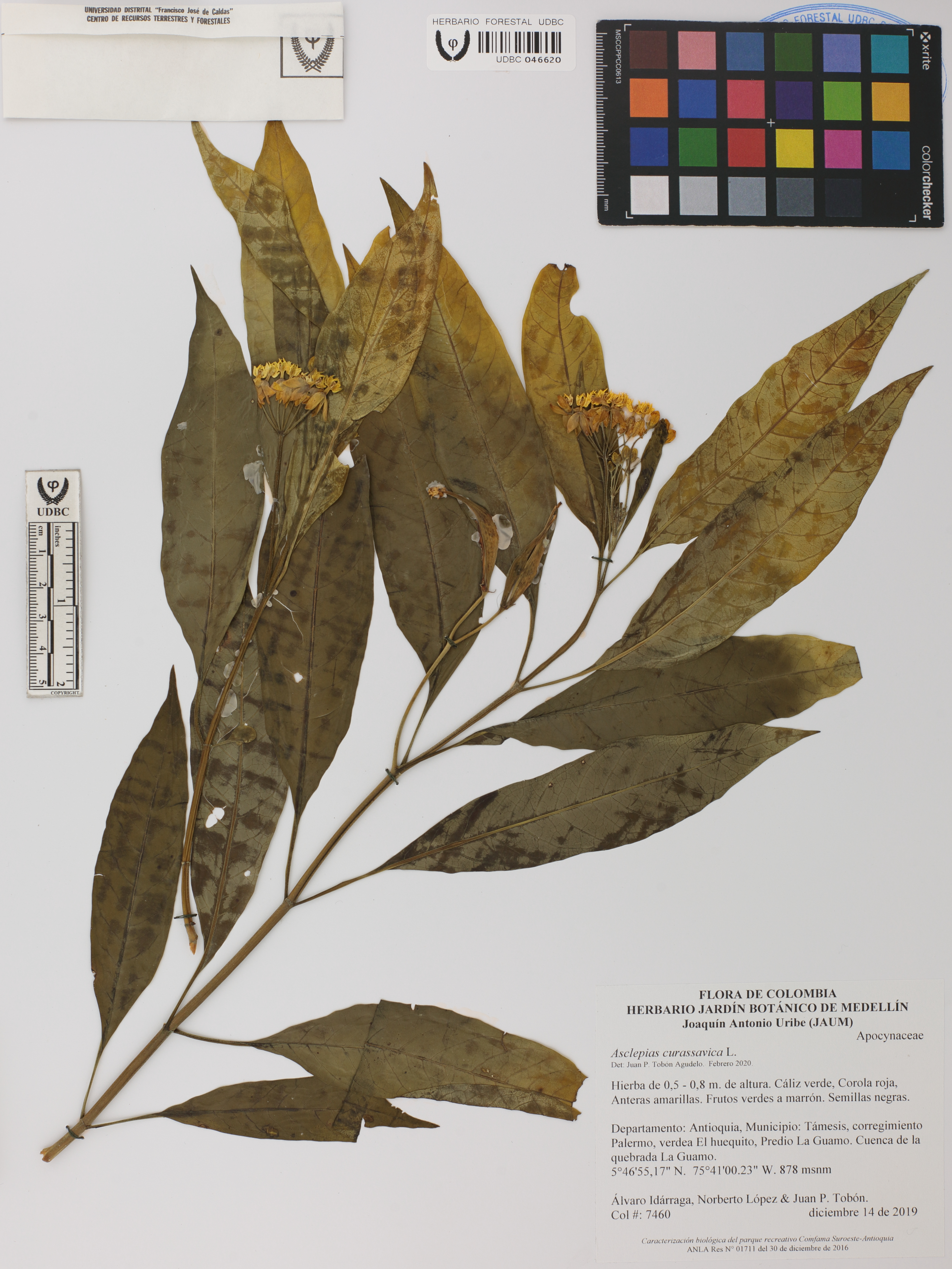 Fotografía del ejemplar Idárraga, Á. 7460, determinado como Asclepias curassavica en el año 2020