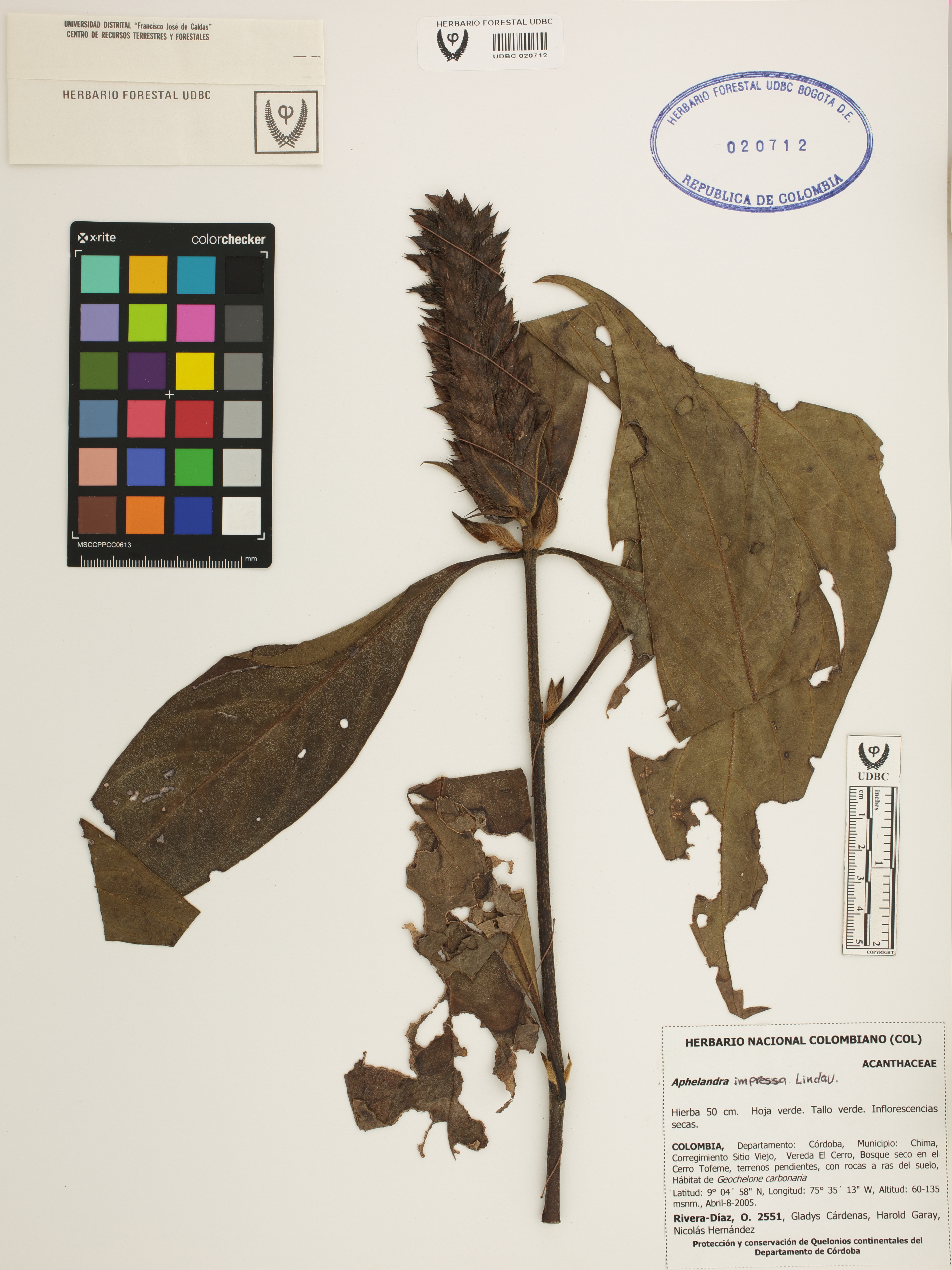Fotografía del ejemplar Rivera-Díaz, O. 2551, determinado como Aphelandra impressa