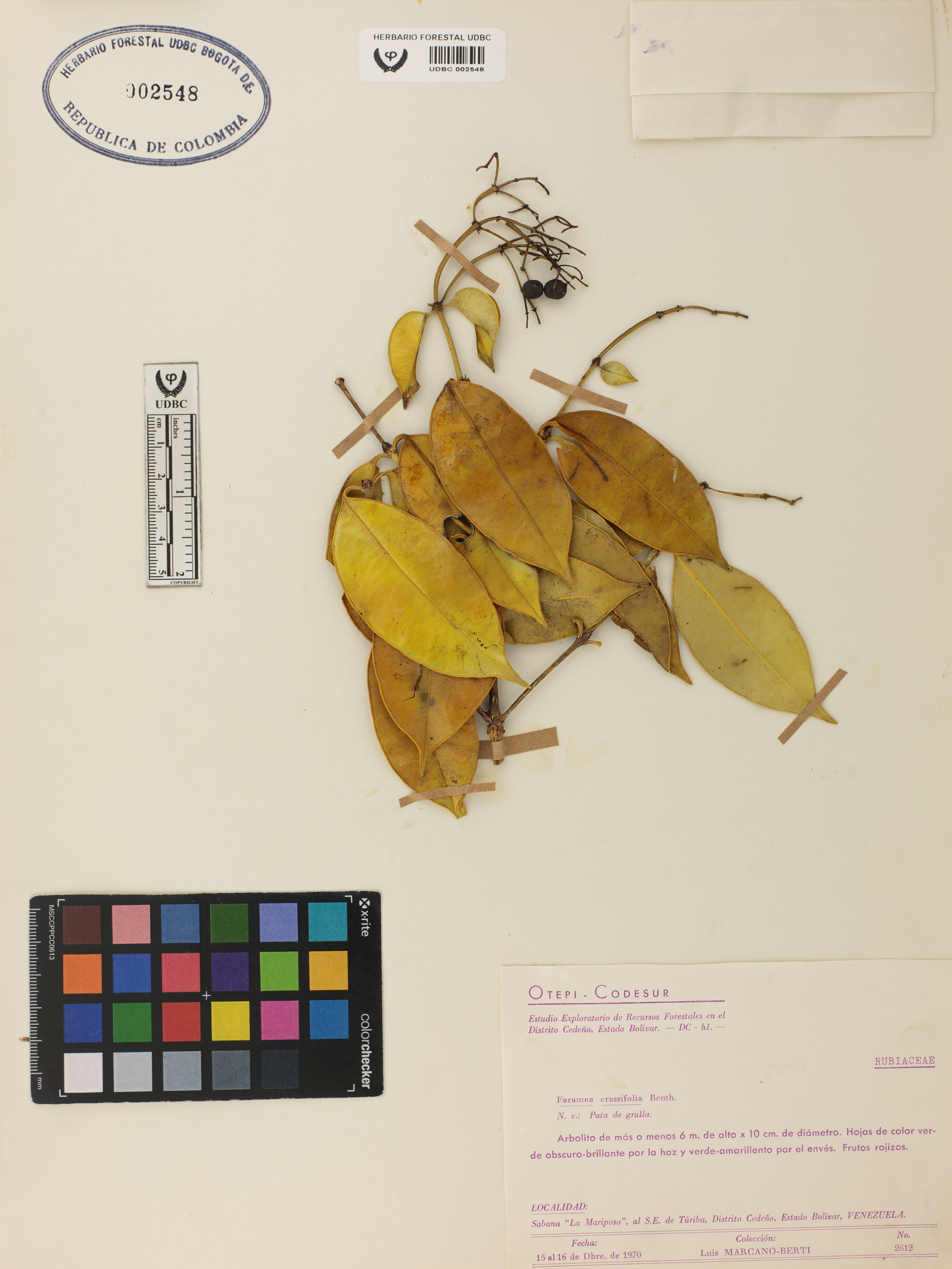 Fotografía del ejemplar Marcano, L. 2612, determinado como Faramea crassifolia