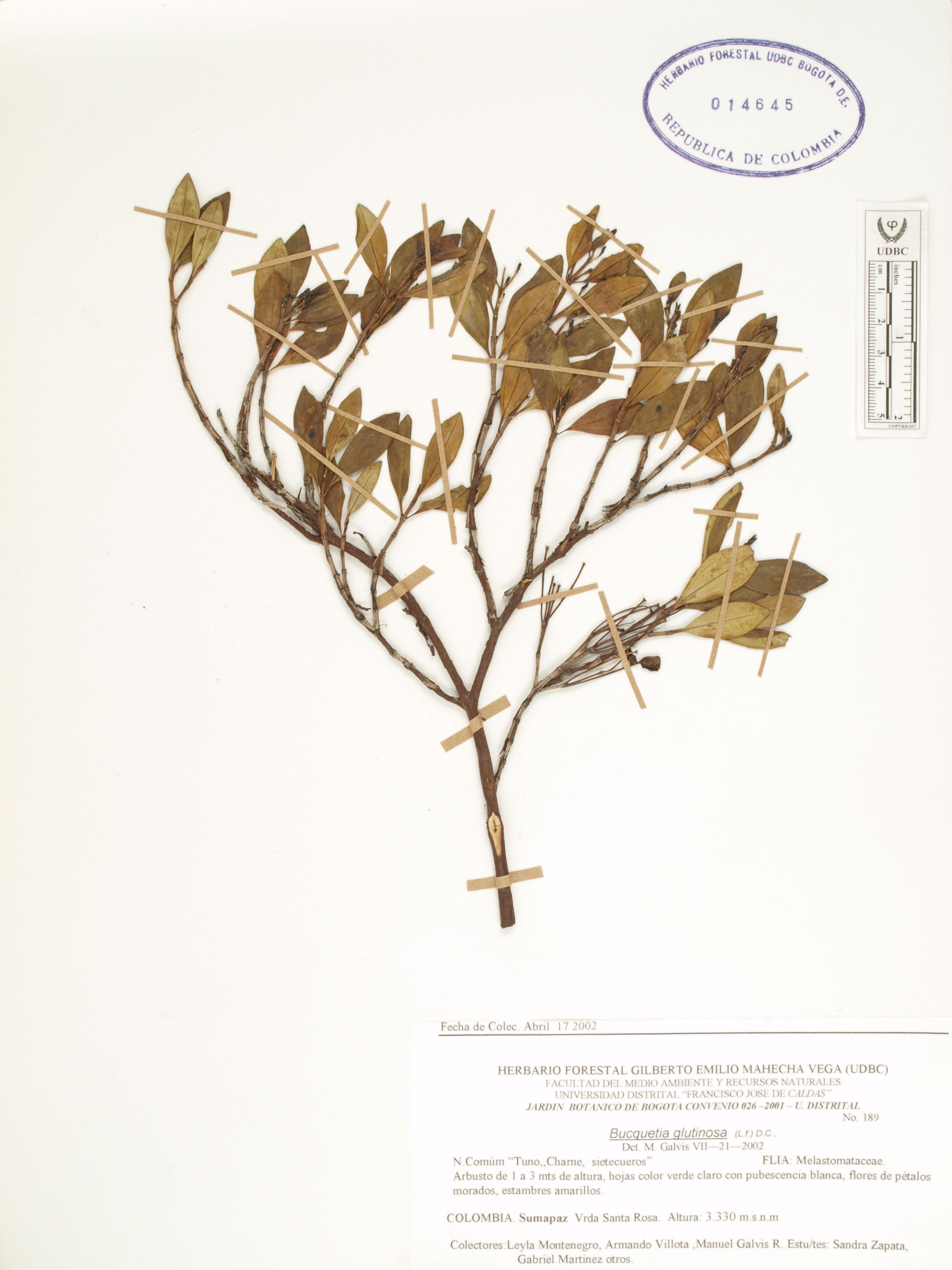 | dc.description | Fotografía del ejemplar Montenegro, L. 189, determinado como Bucquetia glutinosa en el año 2002 | |