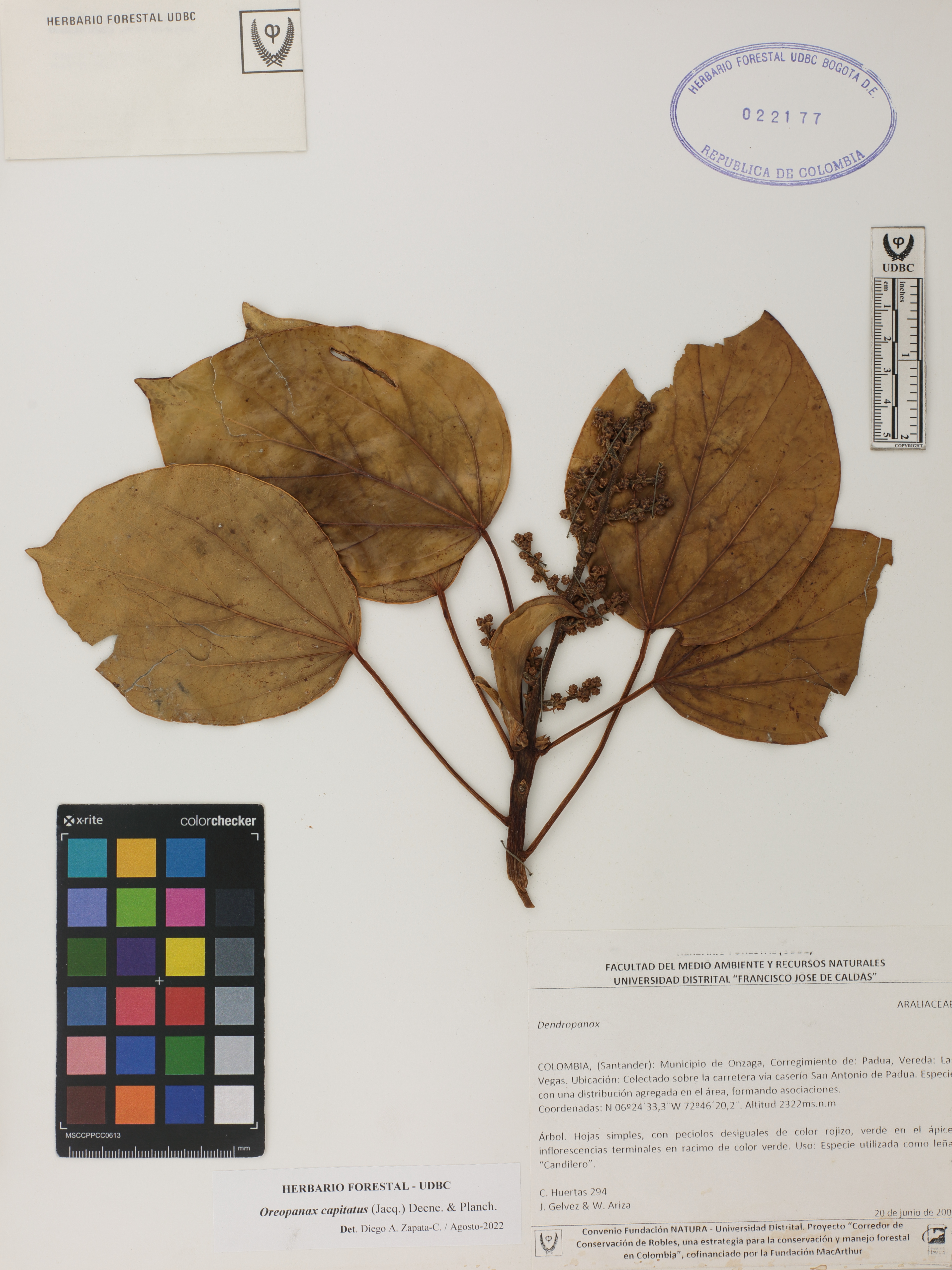 | dc.description | Fotografía del ejemplar Huertas, C. 294, determinado como Oreopanax capitatus en el año 2022 | |