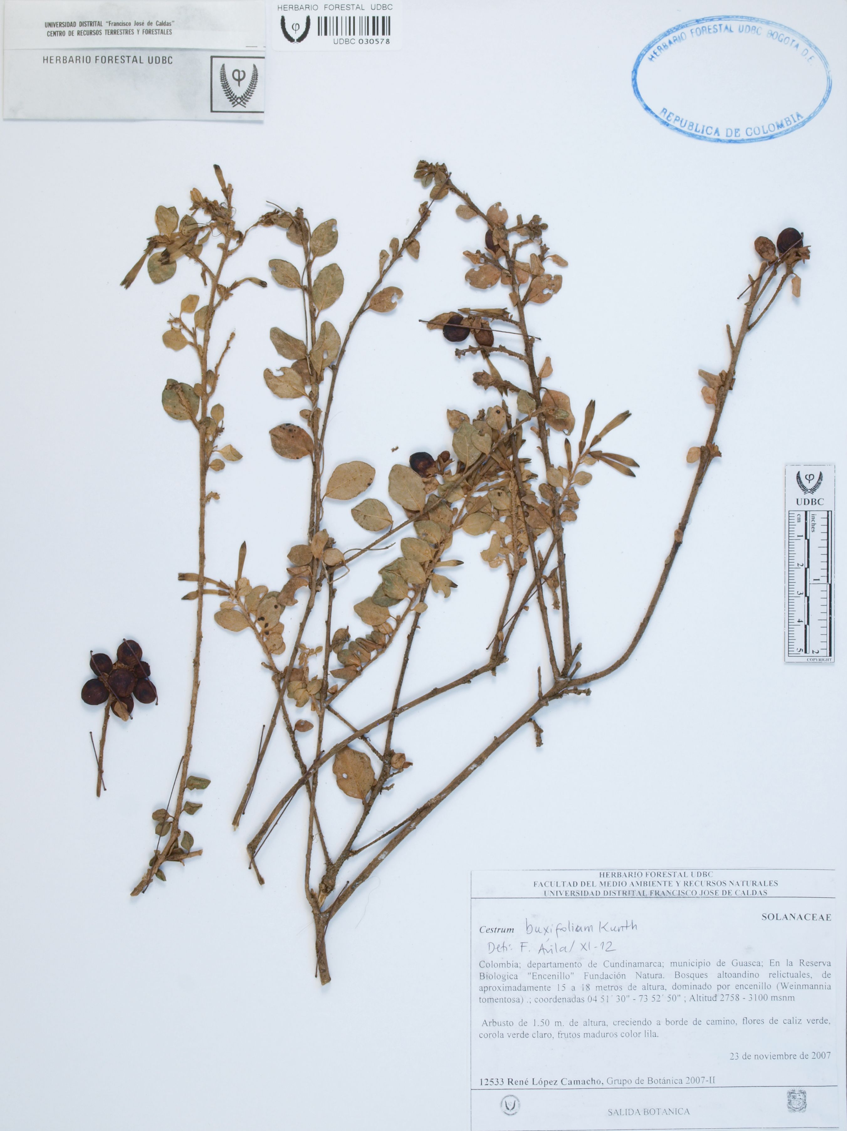 Fotografía del ejemplar López, R. 12533, determinado como Cestrum buxifolium en el año 2012