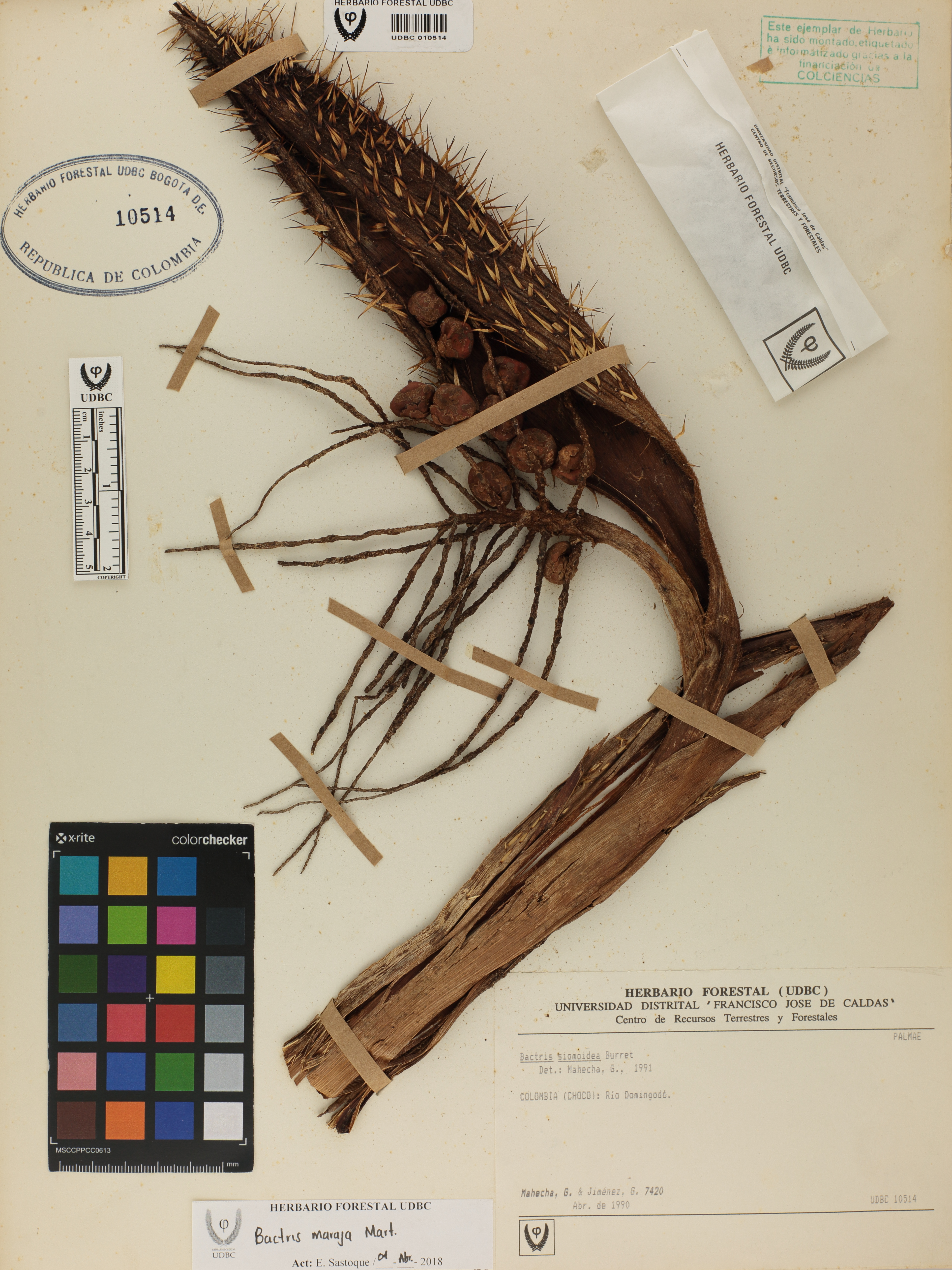 Fotografía del ejemplar Mahecha, G. 7420, determinado como Bactris maraja en el año 1991
