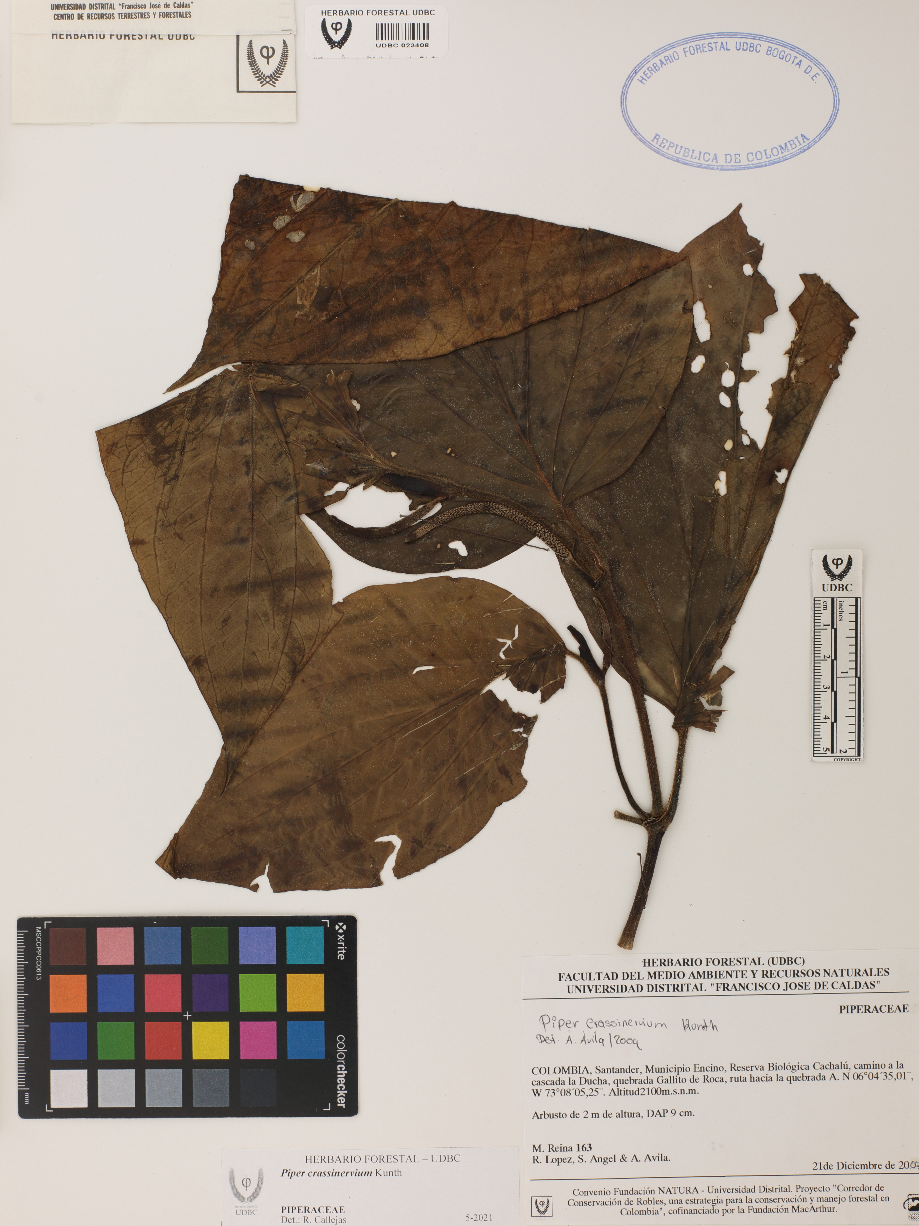 Fotografía del ejemplar Reina, M. 163, determinado como Piper crassinervium en el año 2021