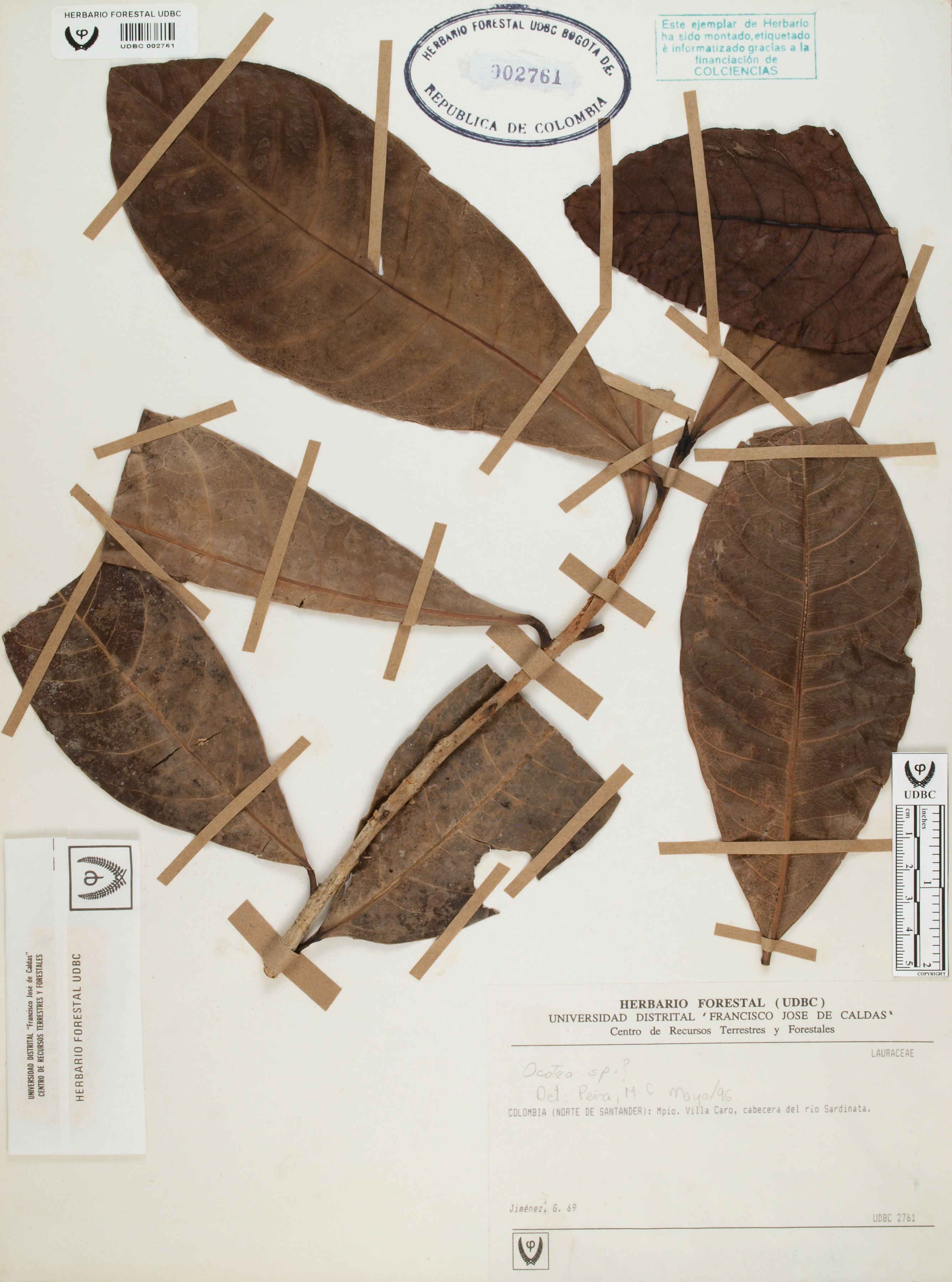 Fotografía del ejemplar Jiménez, G. 69, determinado como Ocotea sp. en el año 1996