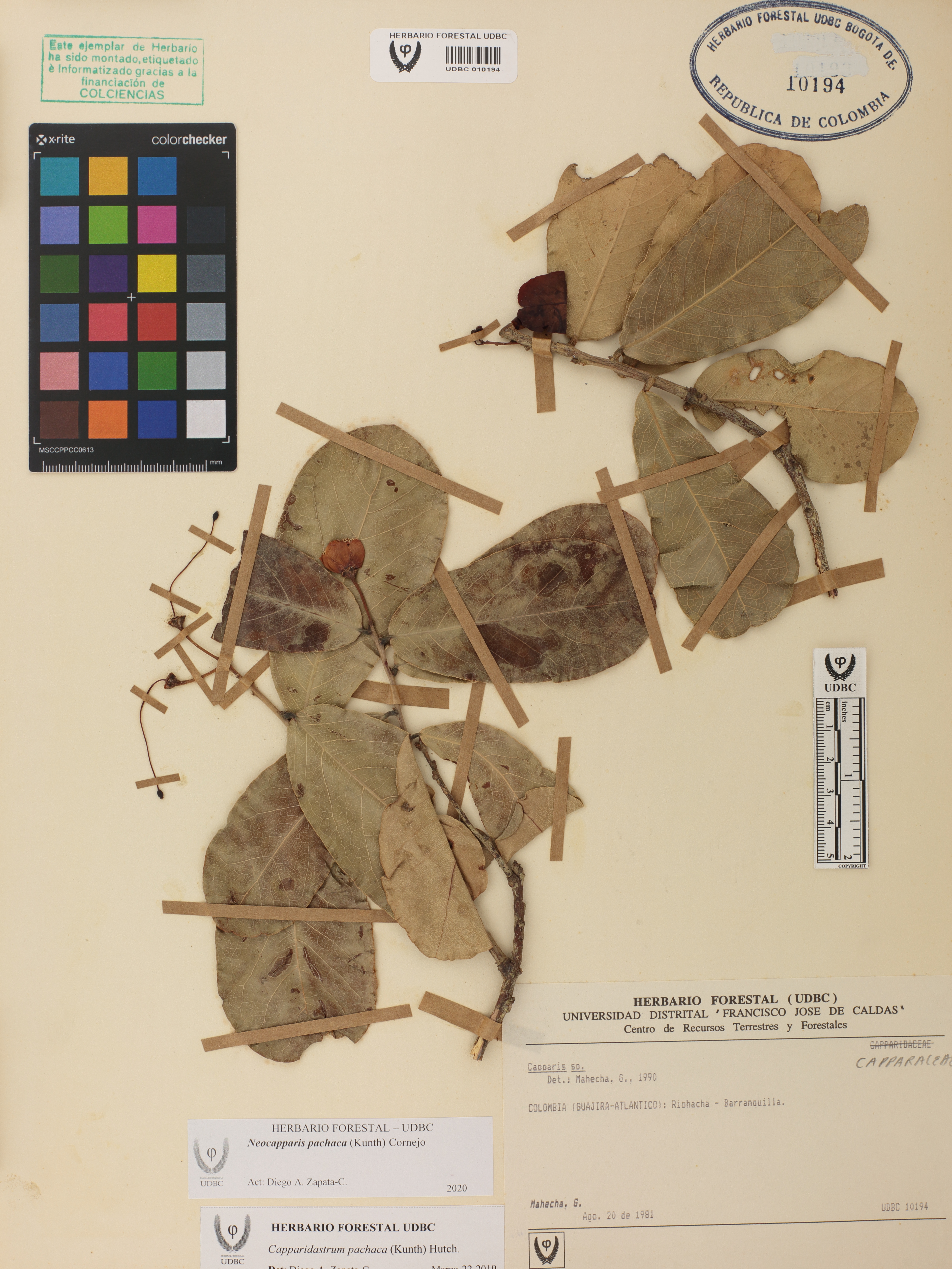 Fotografía del ejemplar Mahecha, G., determinado como Neocapparis pachaca en el año 2020