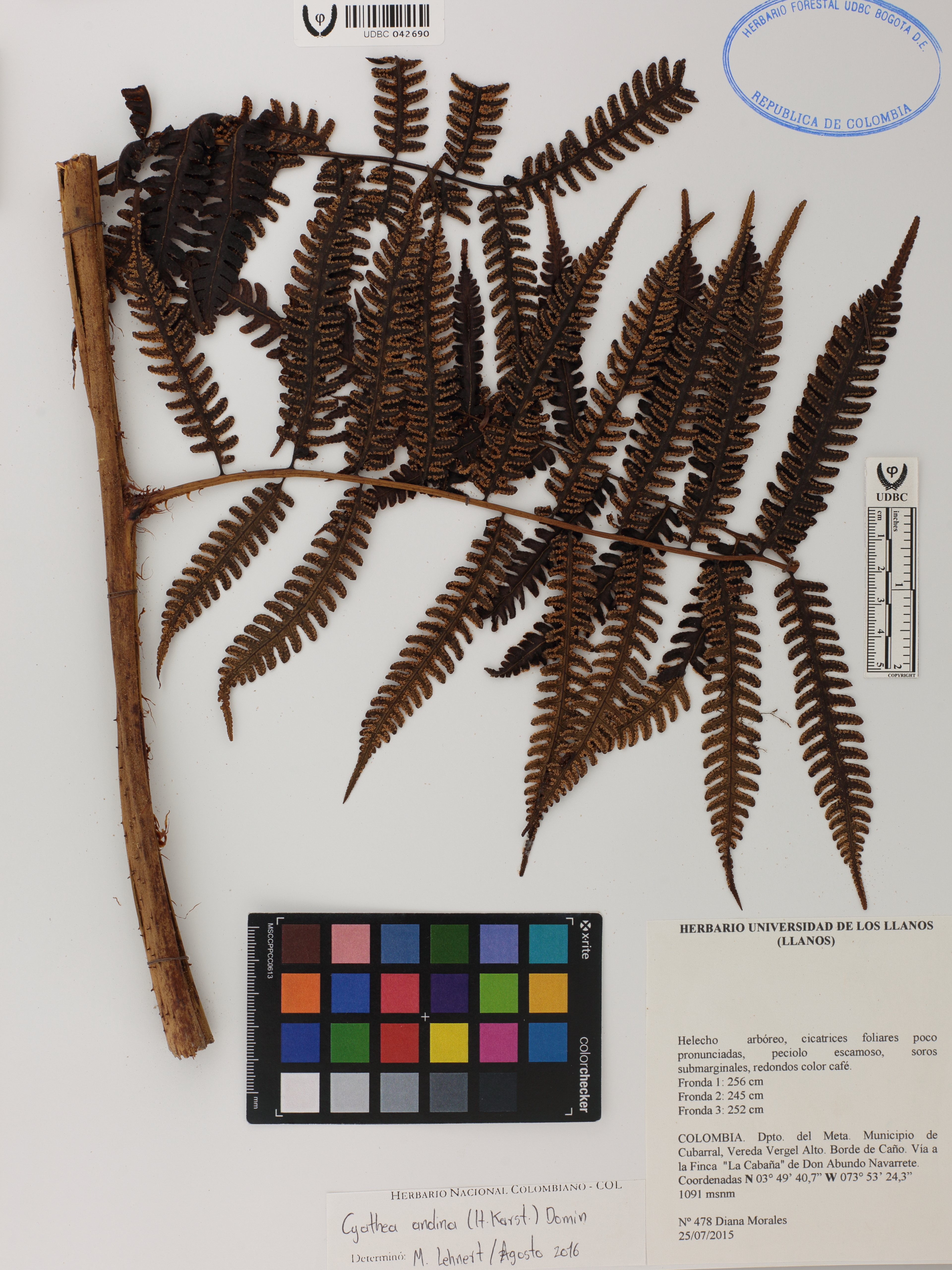 Fotografía del ejemplar Morales, D. 478, determinado como Cyathea andina en el año 2016