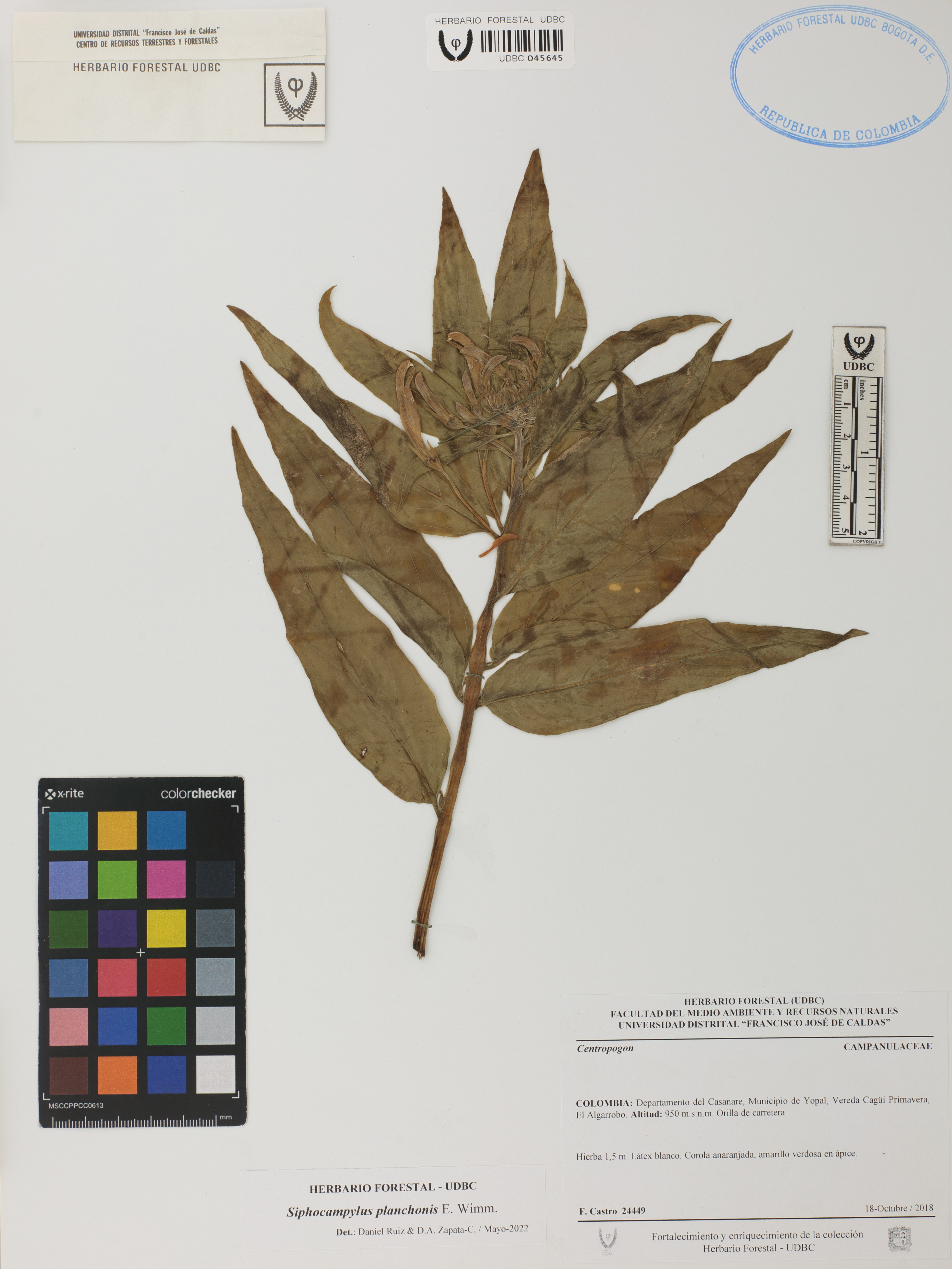 Fotografía del ejemplar Castro, F. 24449, determinado como Siphocampylus planchonis en el año 2022