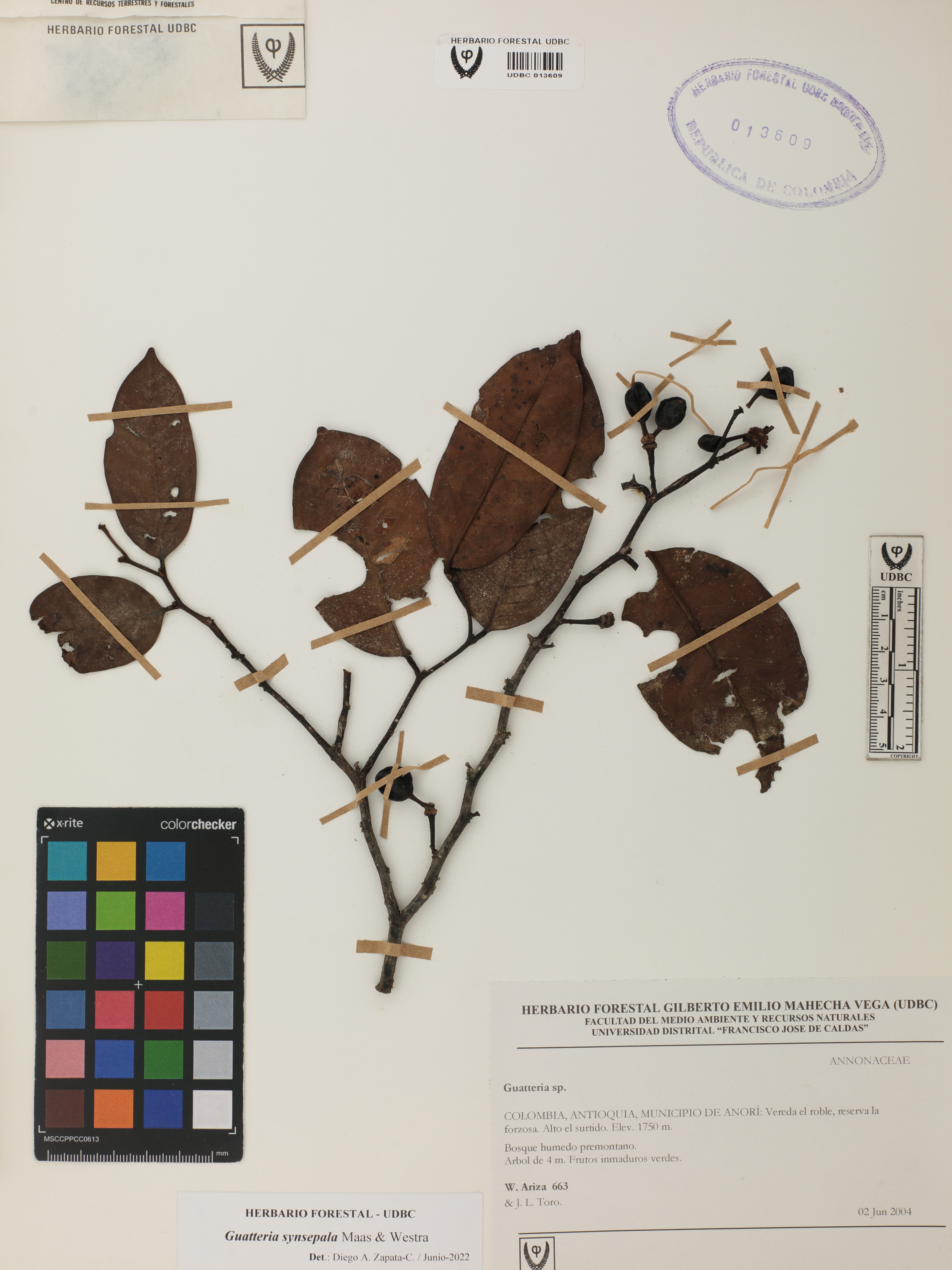 Fotografía del ejemplar Ariza, W. 663, determinado como Guatteria synsepala en el año 2022