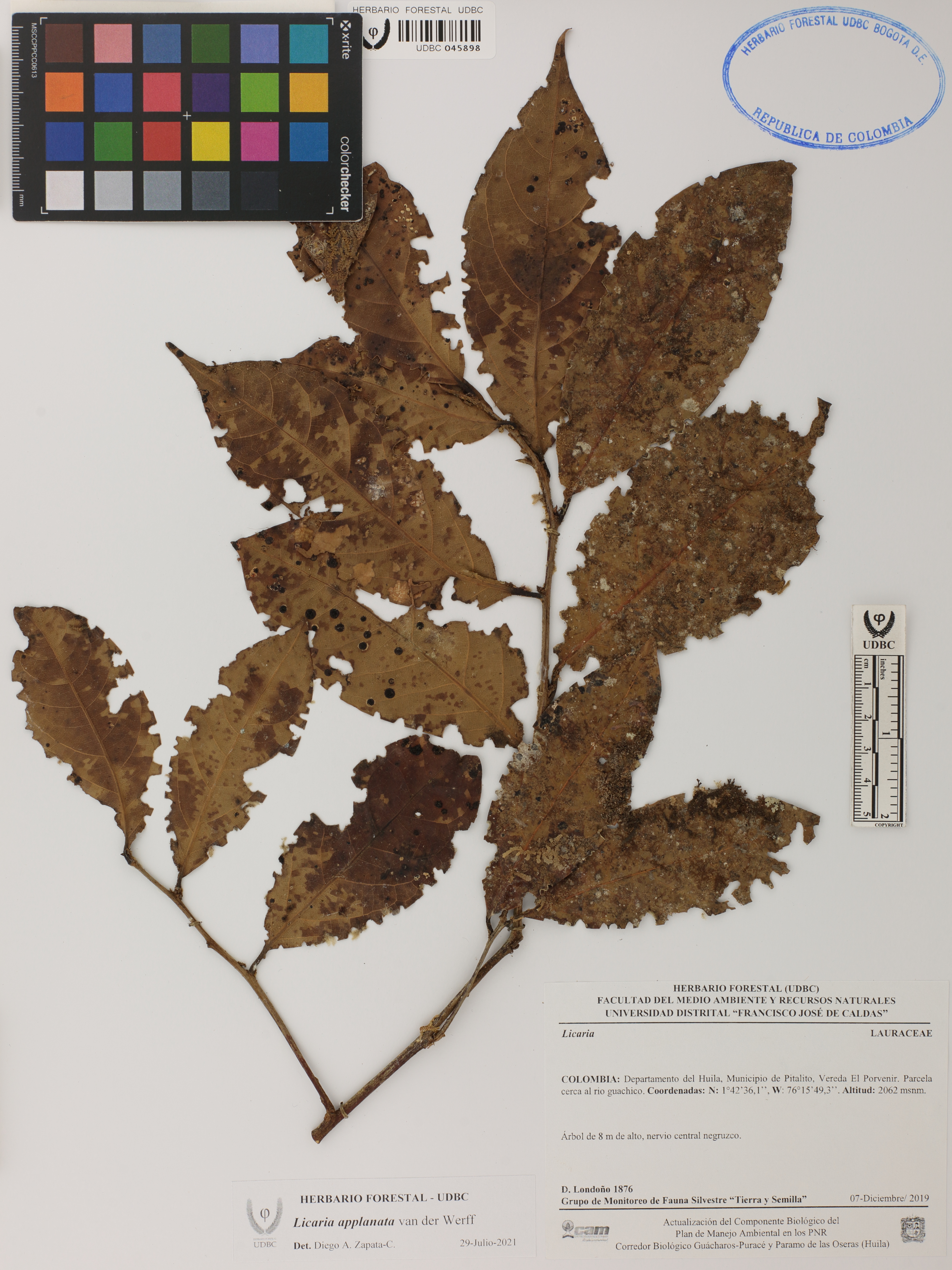 Fotografía del ejemplar Londoño, D. 1876, determinado como Licaria applanata en el año 2021