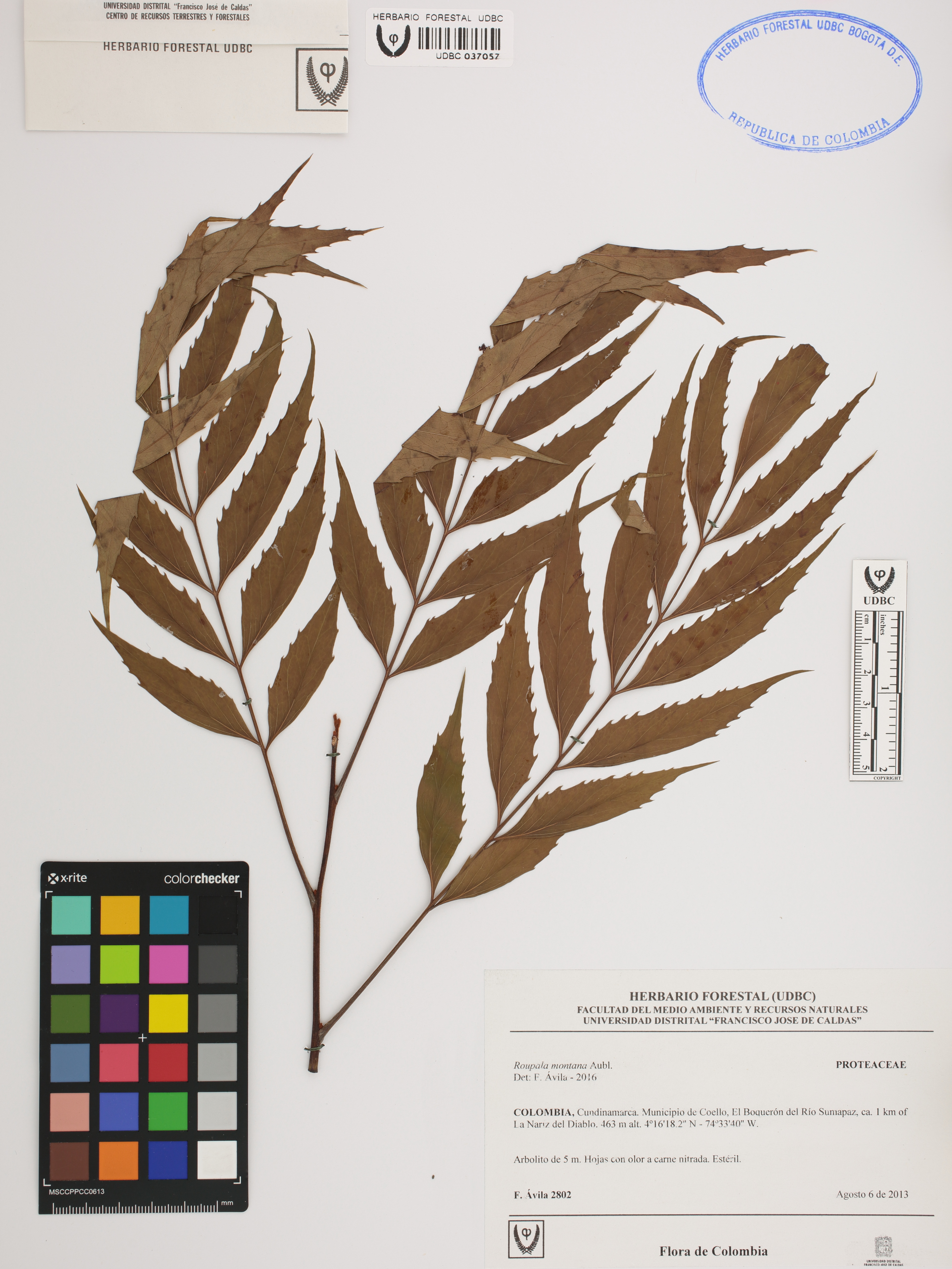 Fotografía del ejemplar Ávila, F. 2802, determinado como Roupala montana en el año 2016