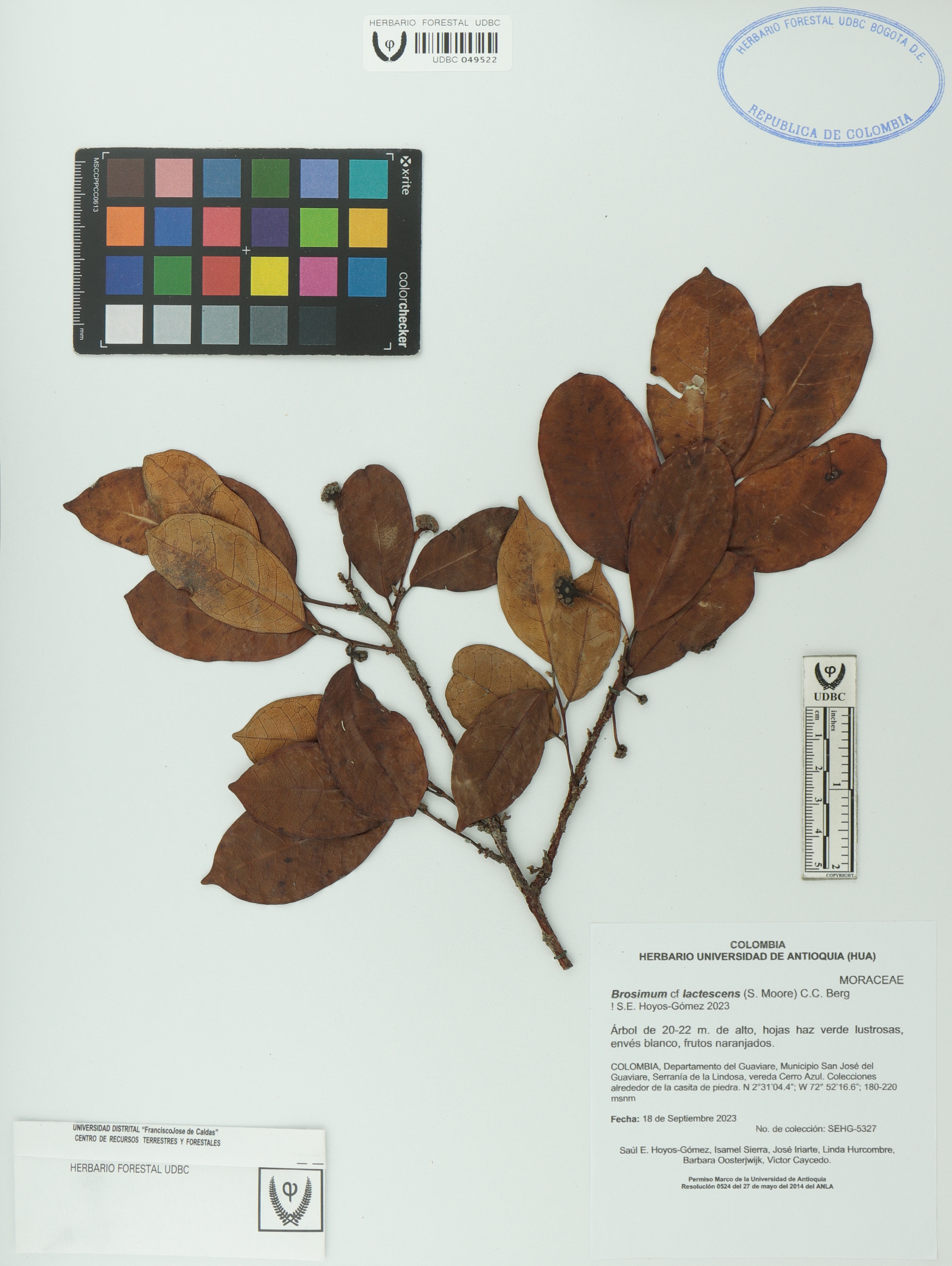 Fotografía del ejemplar Hoyos-G., S. 5327, determinado como Brosimum lactescens en el año 2023