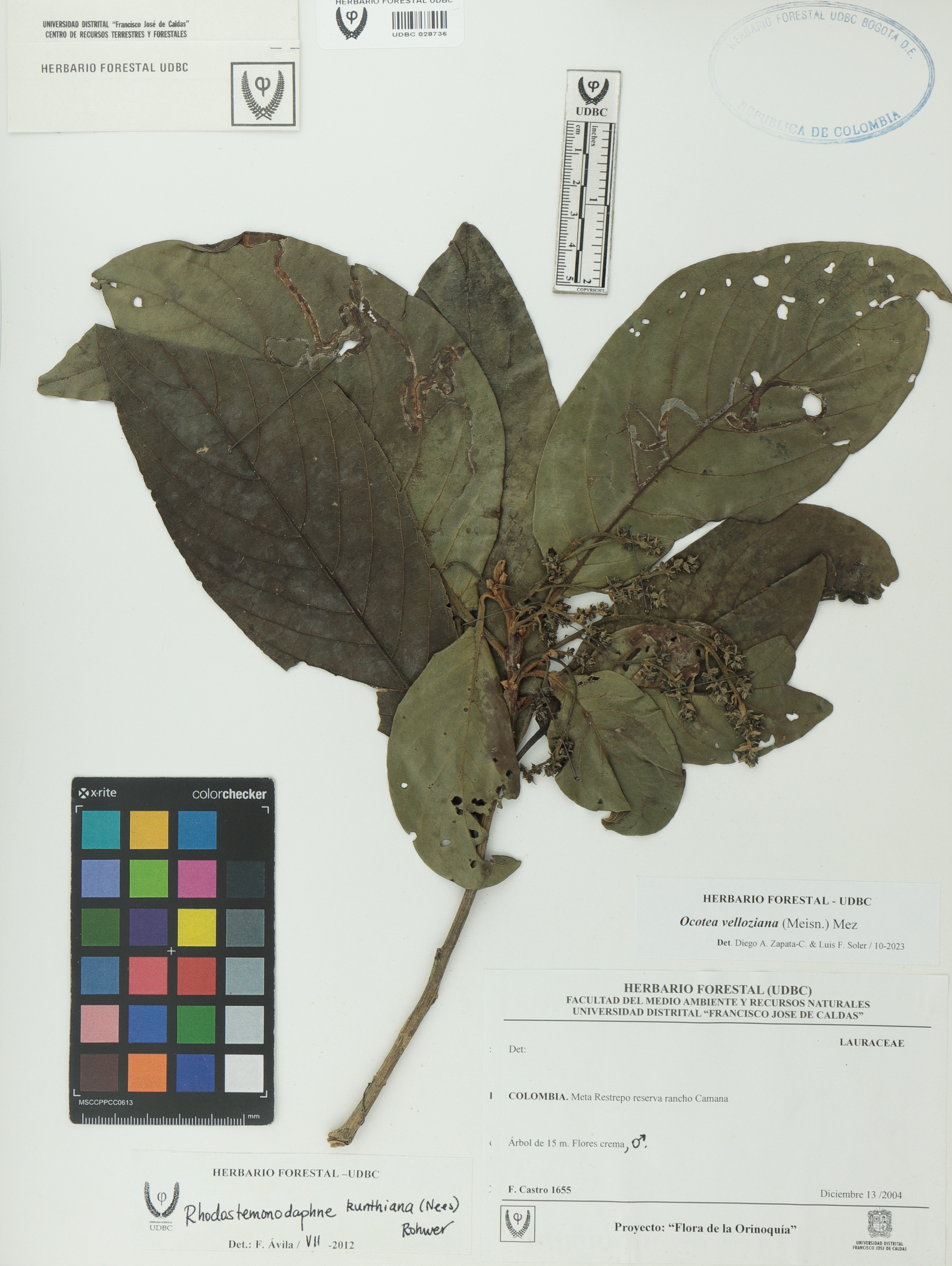 Fotografía del ejemplar Castro, F. 1655, determinado como Ocotea velloziana en el año 2023