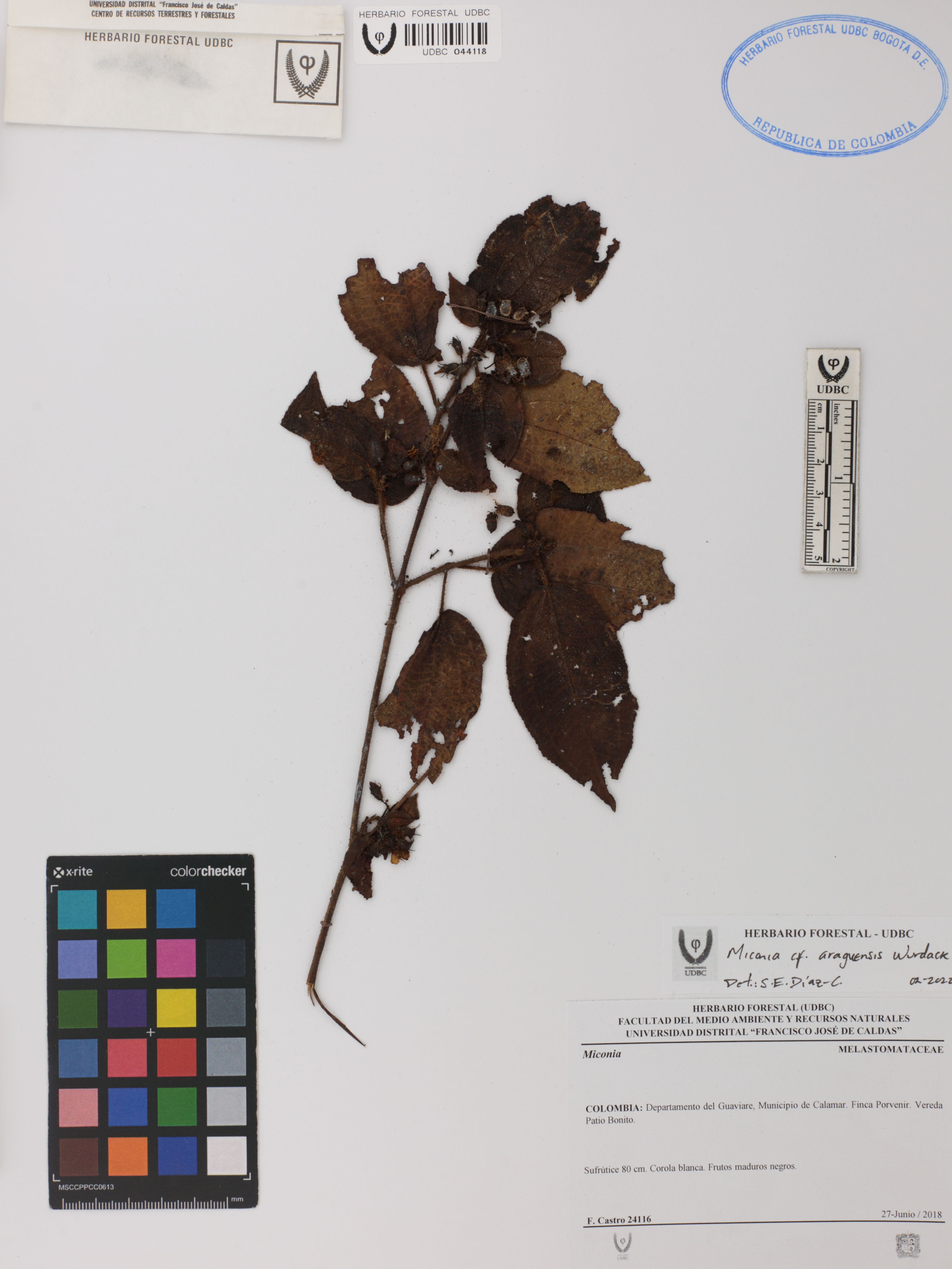 Fotografía del ejemplar Castro, F. 24116, determinado como Miconia araguensis en el año 2022
