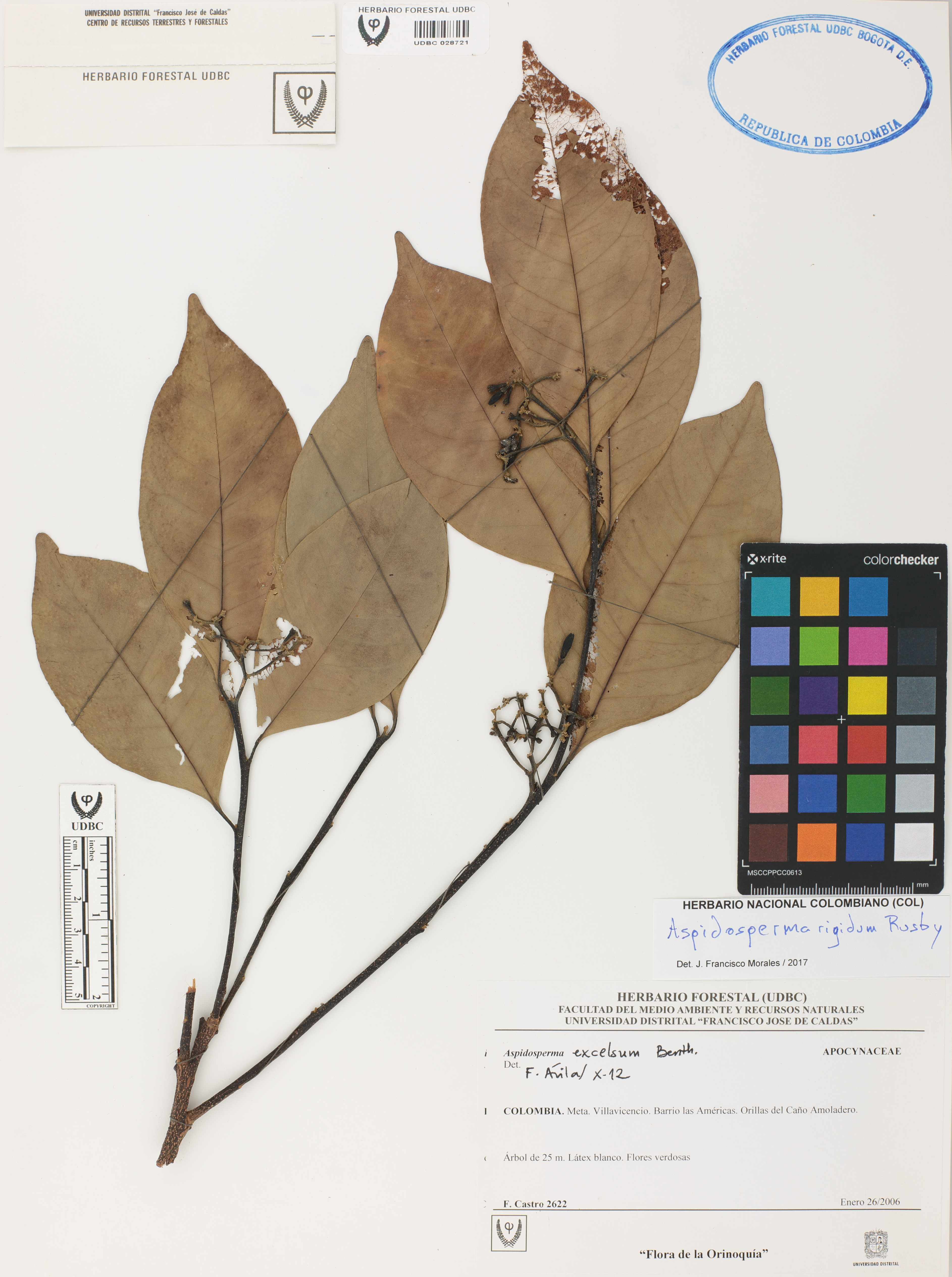 Fotografía del ejemplar Castro, F. 2622, determinado como Aspidosperma rigidum en el año 2017