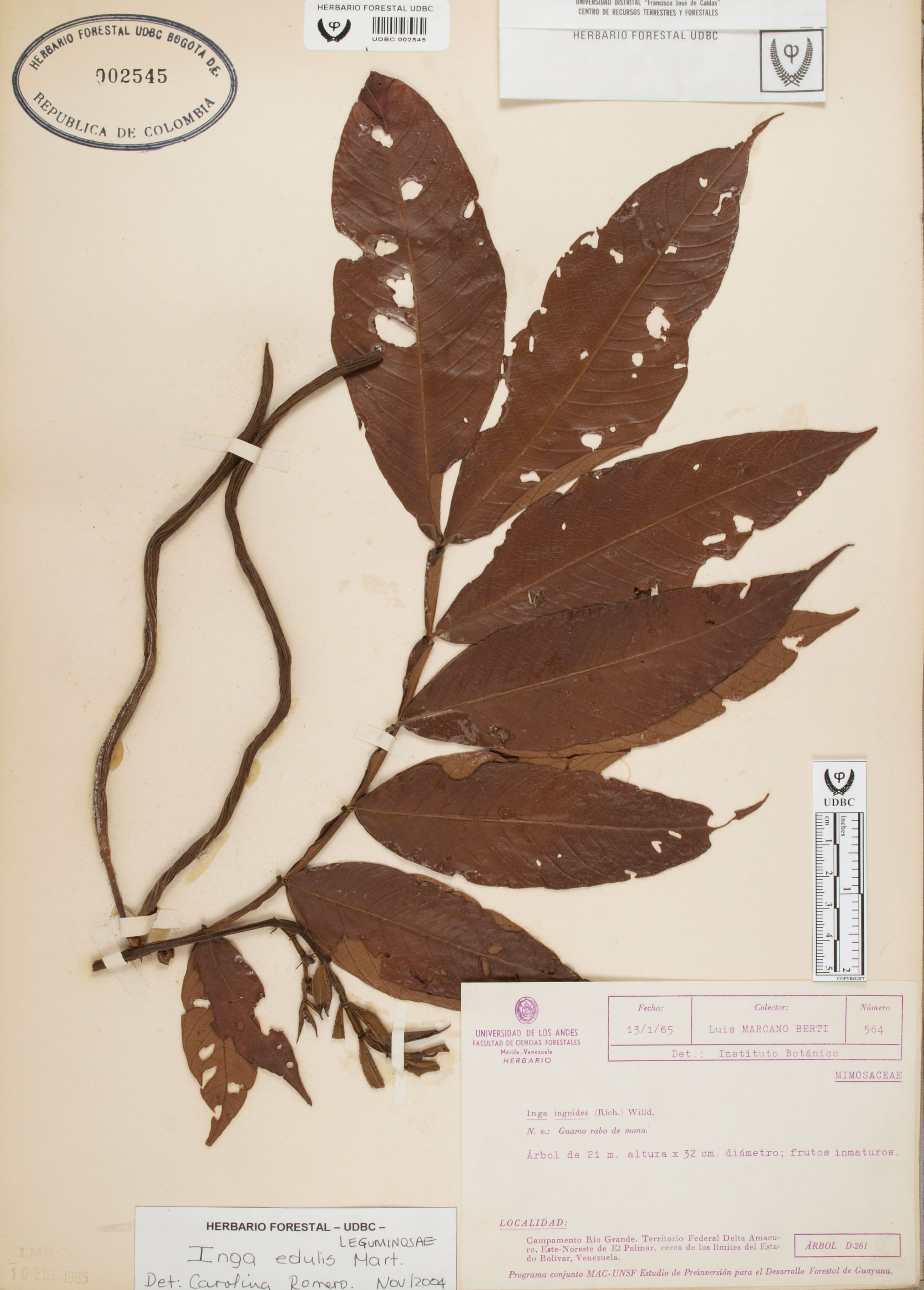 Fotografía del ejemplar Marcano, L. 564, determinado como Inga edulis en el año 2004
