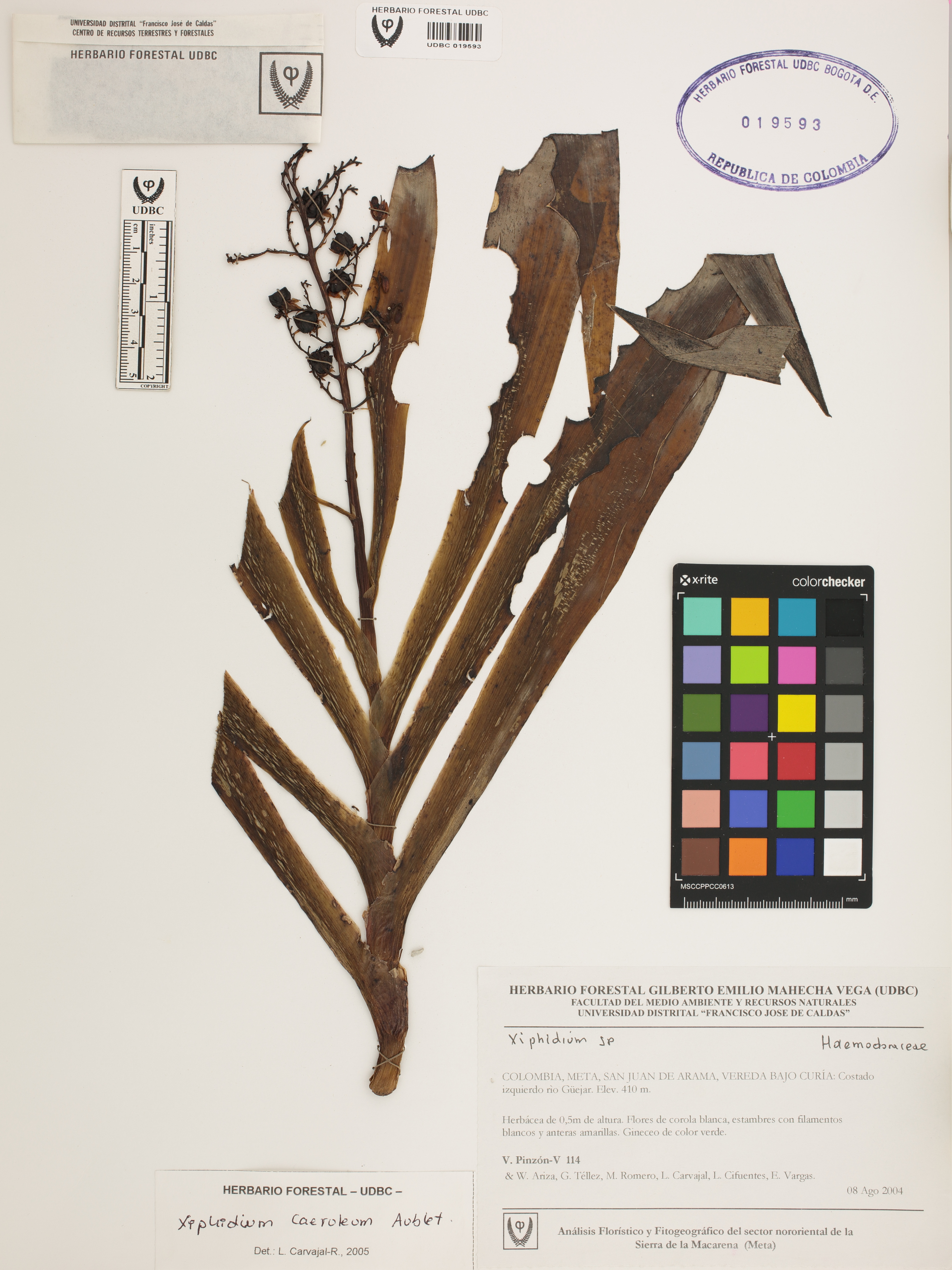 Fotografía del ejemplar Pinzón-V., V. 114, determinado como Xiphidium caeruleum en el año 2005