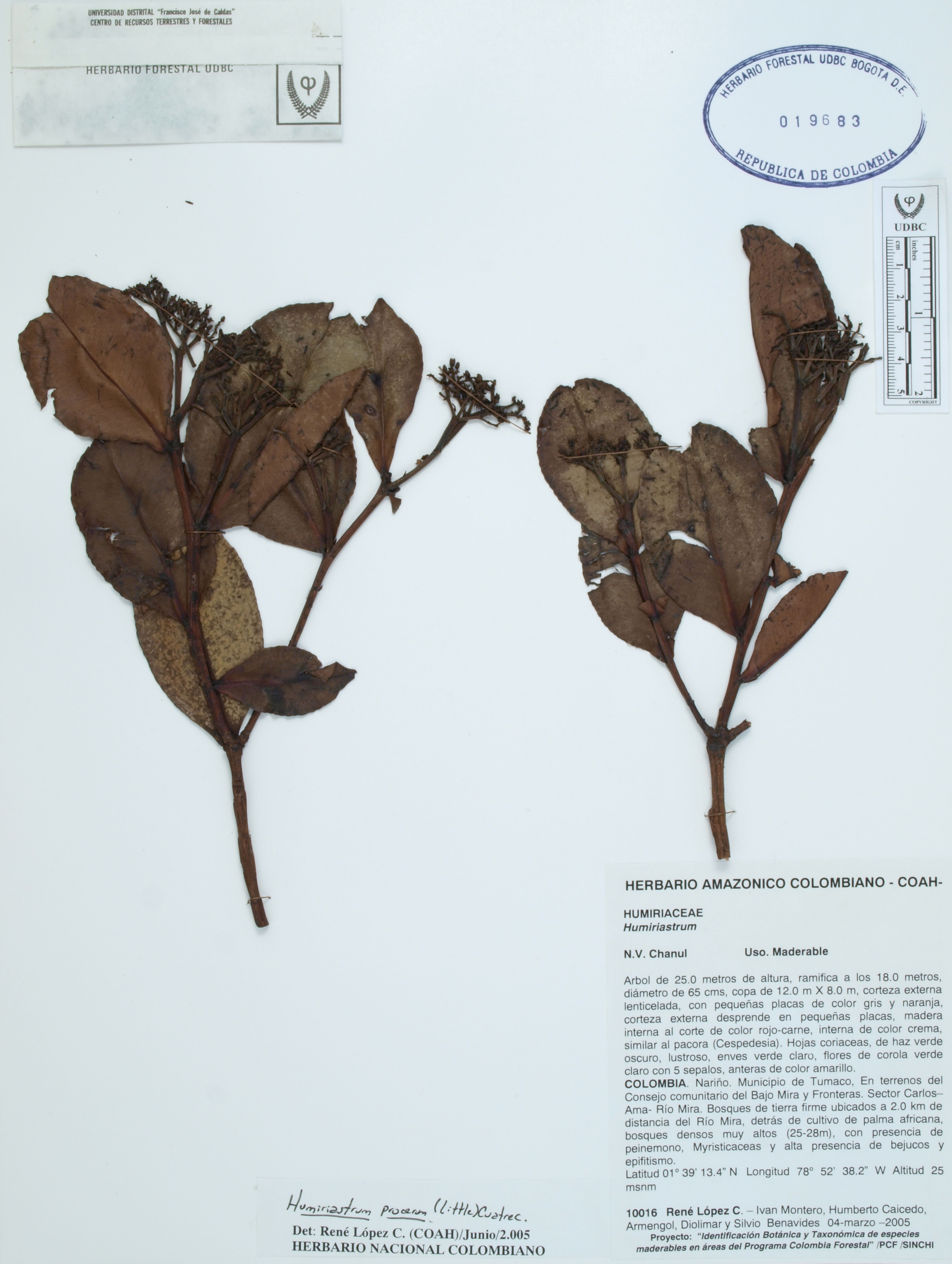 Fotografía del ejemplar López, R. 10016, determinado como Humiriastrum procerum en el año 2005