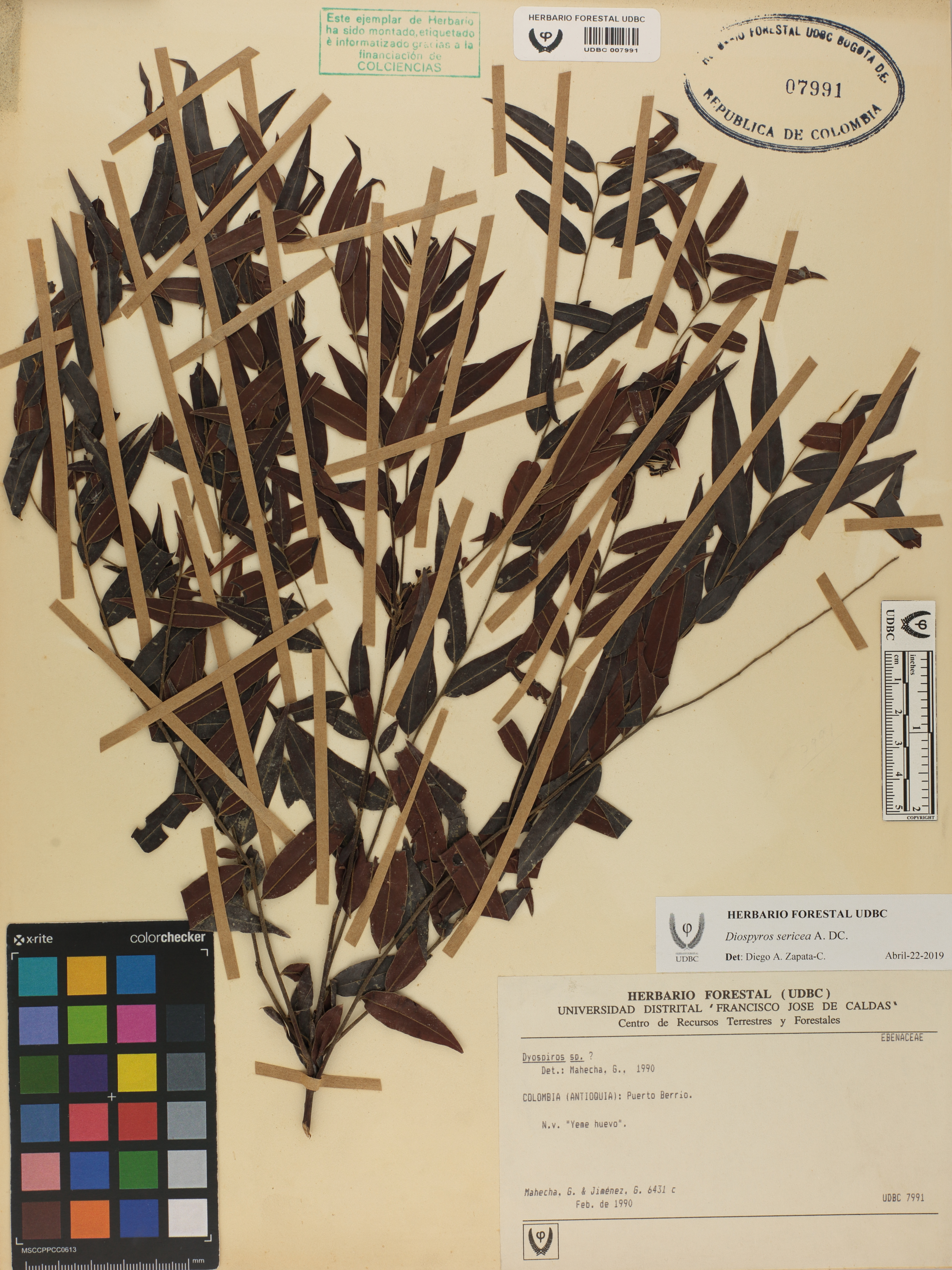 Fotografía del ejemplar Mahecha, G. 6431, determinado como Diospyros sericea en el año 2019