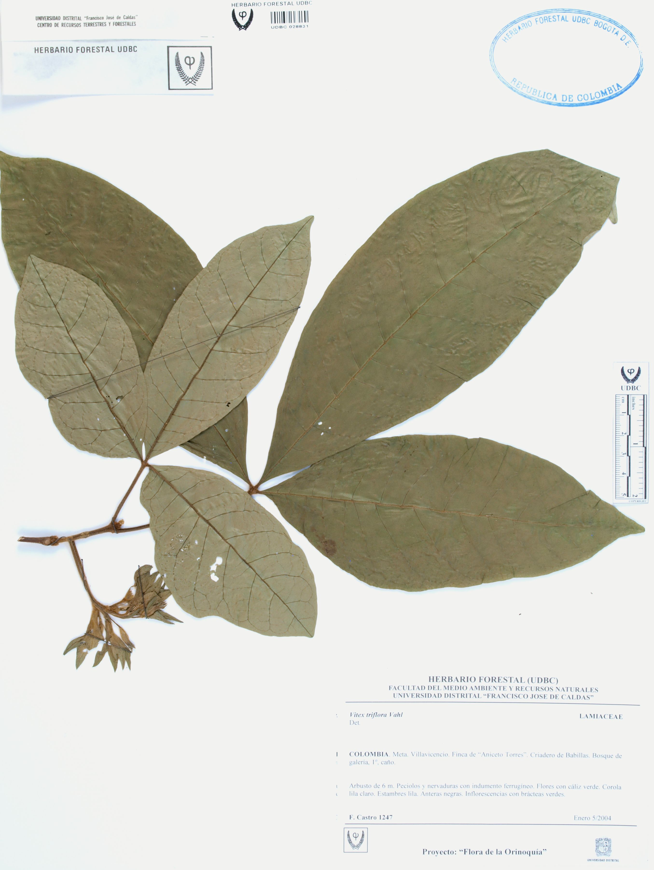 Fotografía del ejemplar Castro, F. 1247, determinado como Vitex triflora