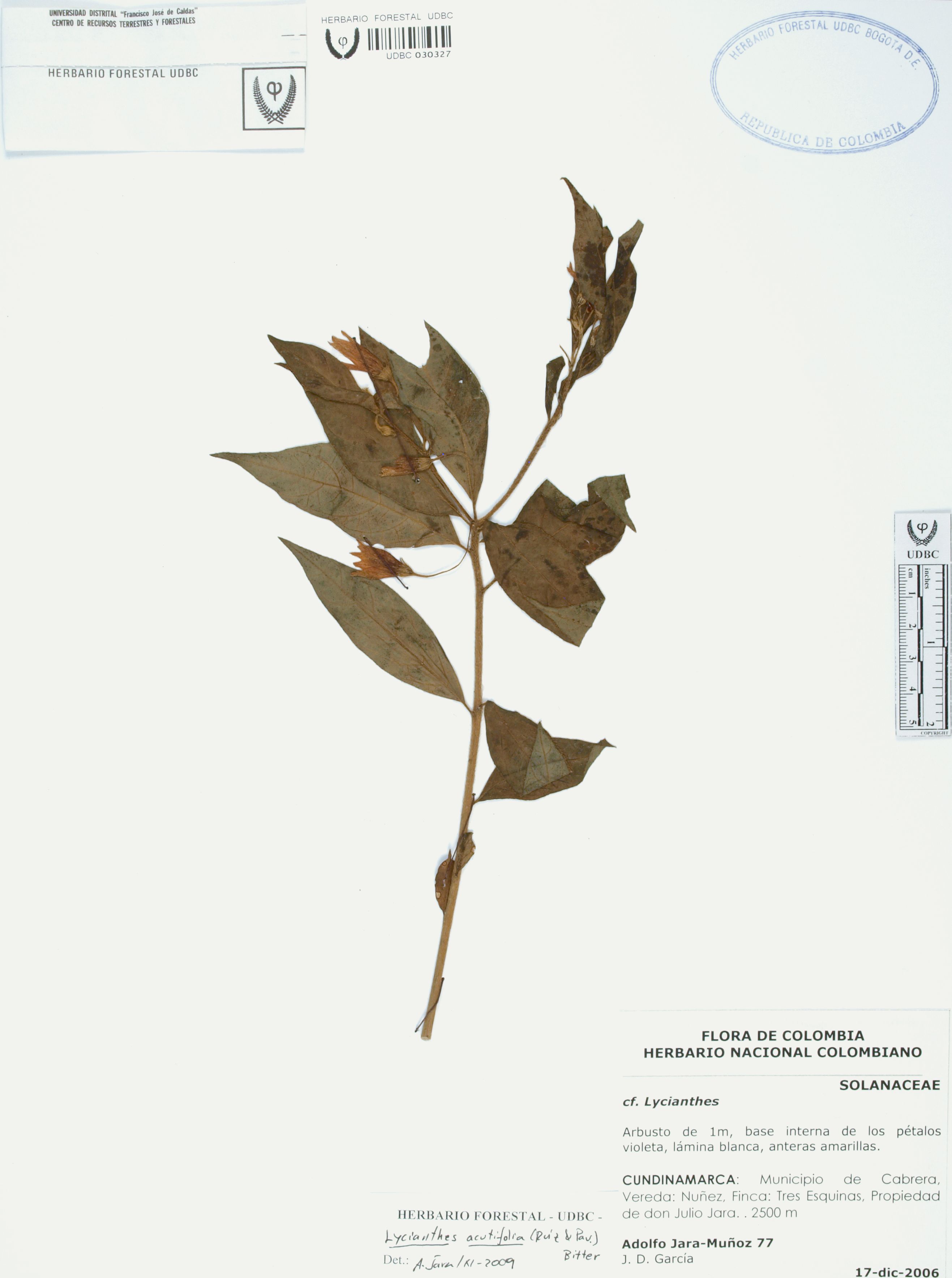 Fotografía del ejemplar Jara, A. 77, determinado como Lycianthes acutifolia en el año 2009