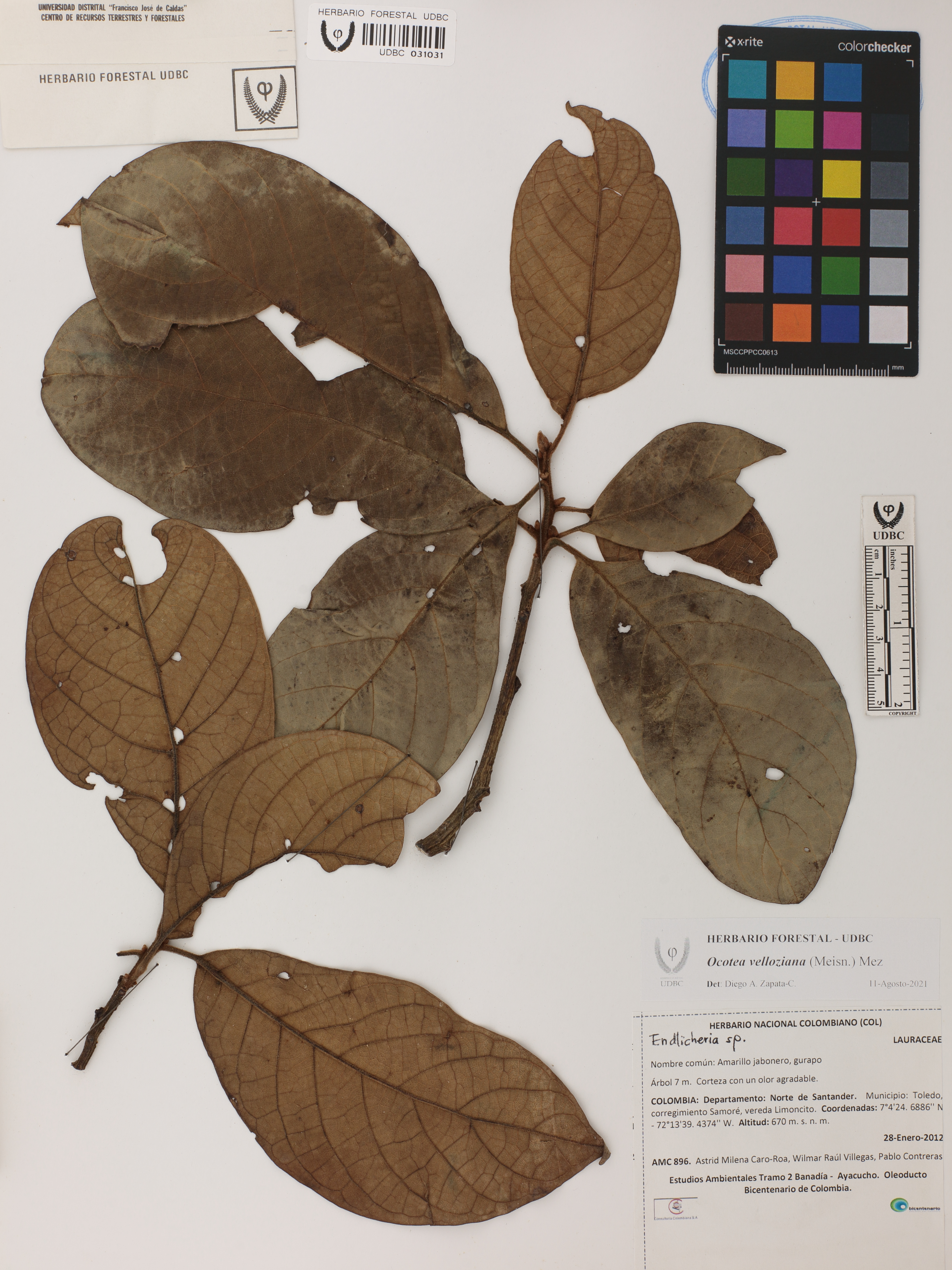 Fotografía del ejemplar Caro-Roa, A. 896, determinado como Ocotea velloziana en el año 2021