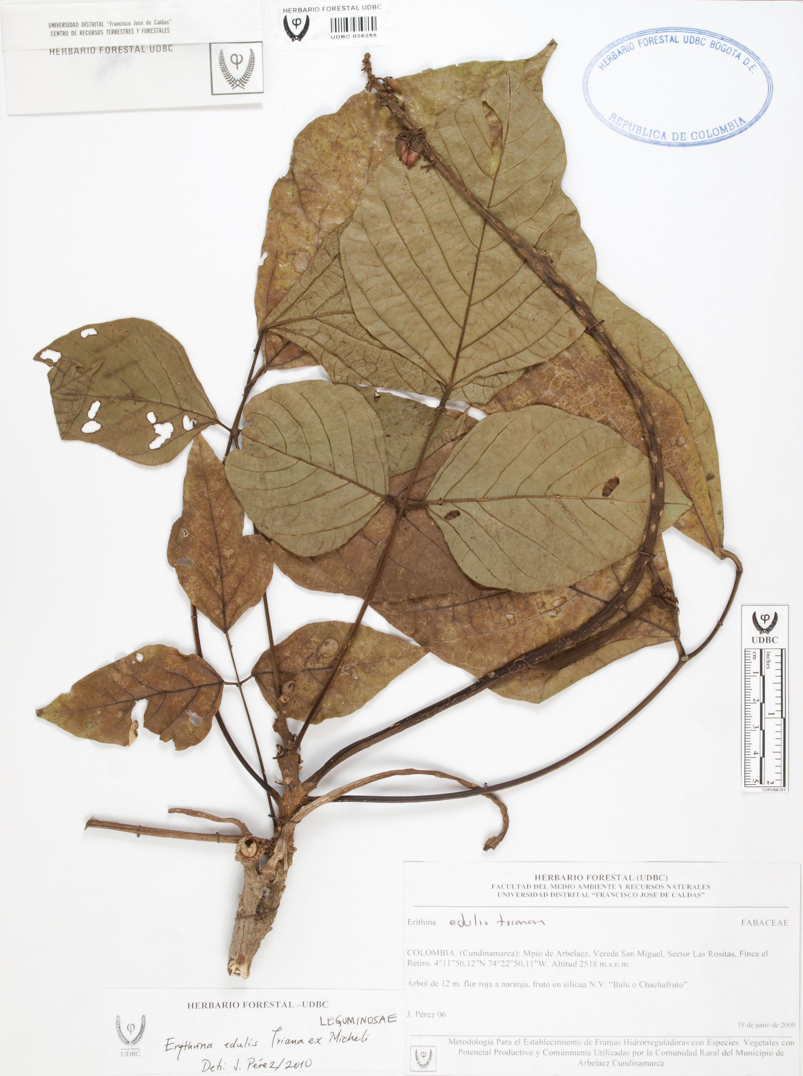 Fotografía del ejemplar Pérez, J. 6, determinado como Erythrina edulis en el año 2010