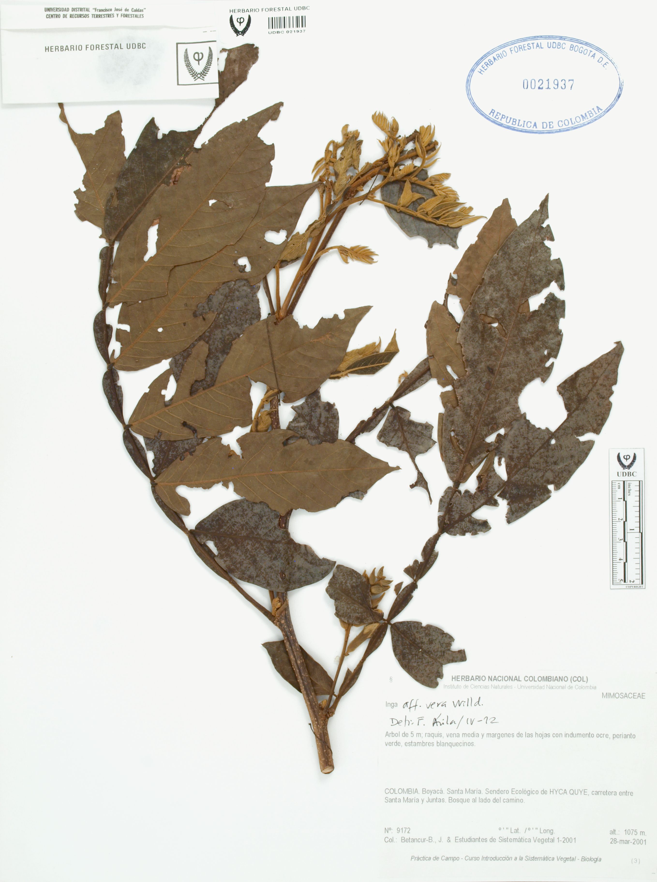 Fotografía del ejemplar Betancur, J. 9172, determinado como Inga vera en el año 2012