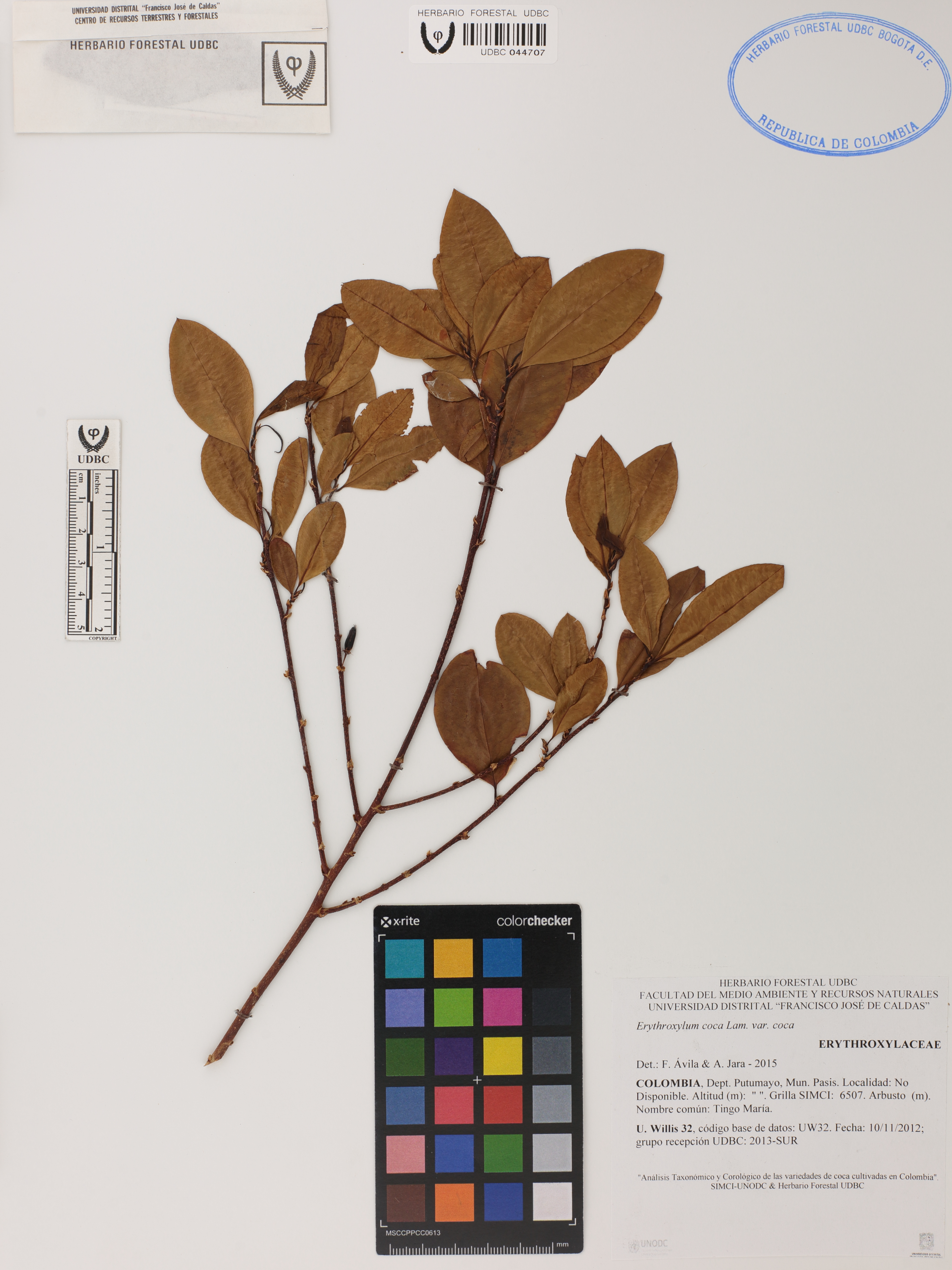 | dc.description | Fotografía del ejemplar Willis, U. 32, determinado como Erythroxylum coca var. coca en el año 2015 | |