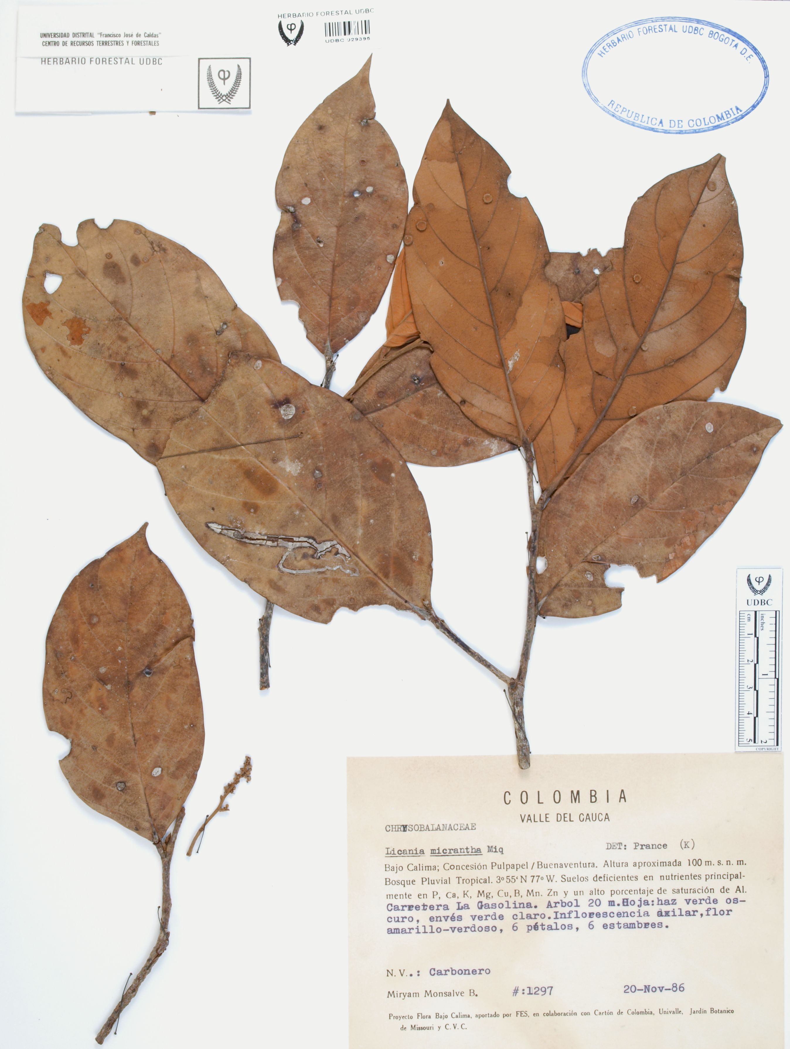 Fotografía del ejemplar Monsalve, M. 1297, determinado como Licania micrantha