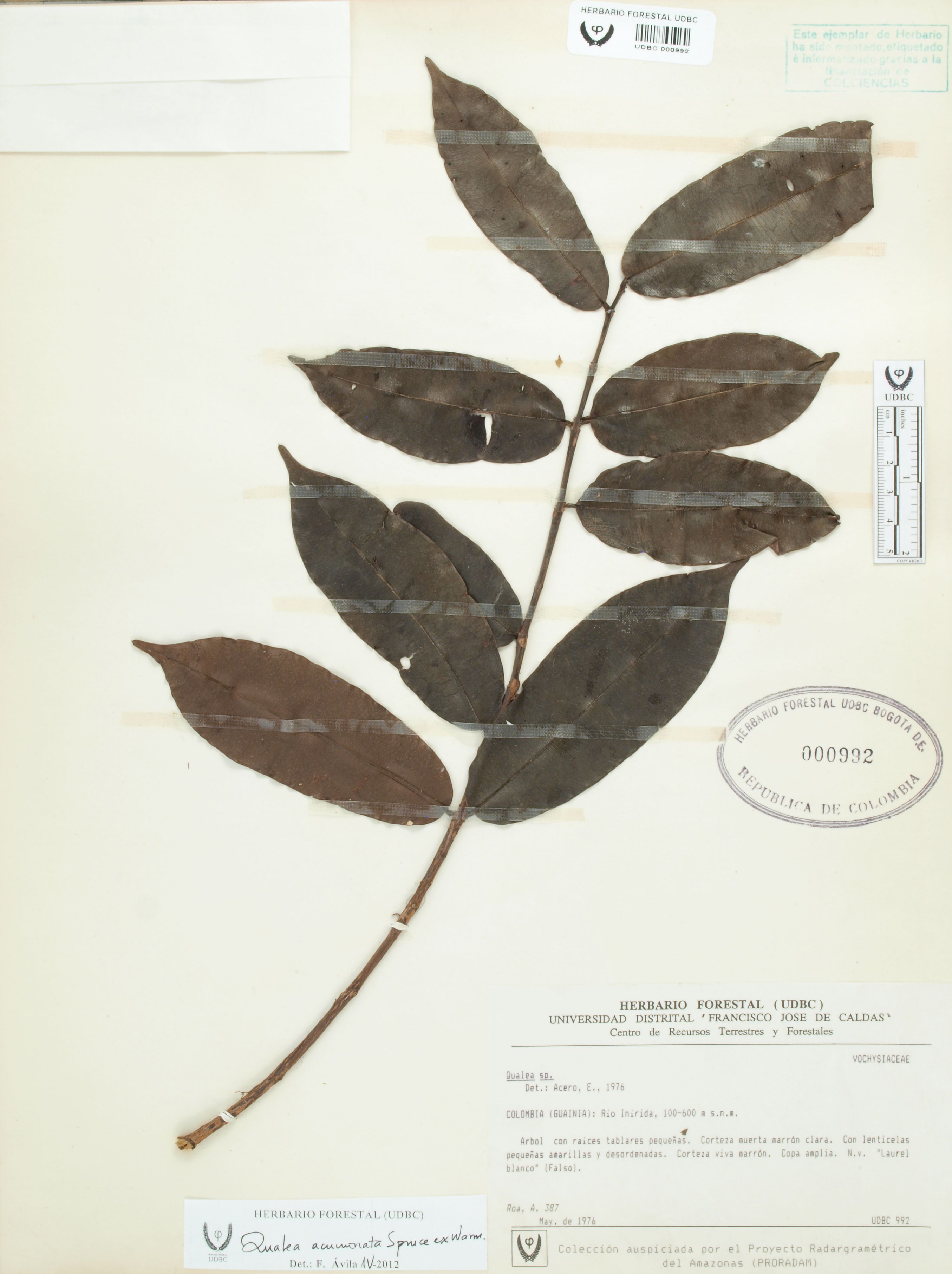 Fotografía del ejemplar Roa, A. 387, determinado como Qualea acuminata en el año 2012