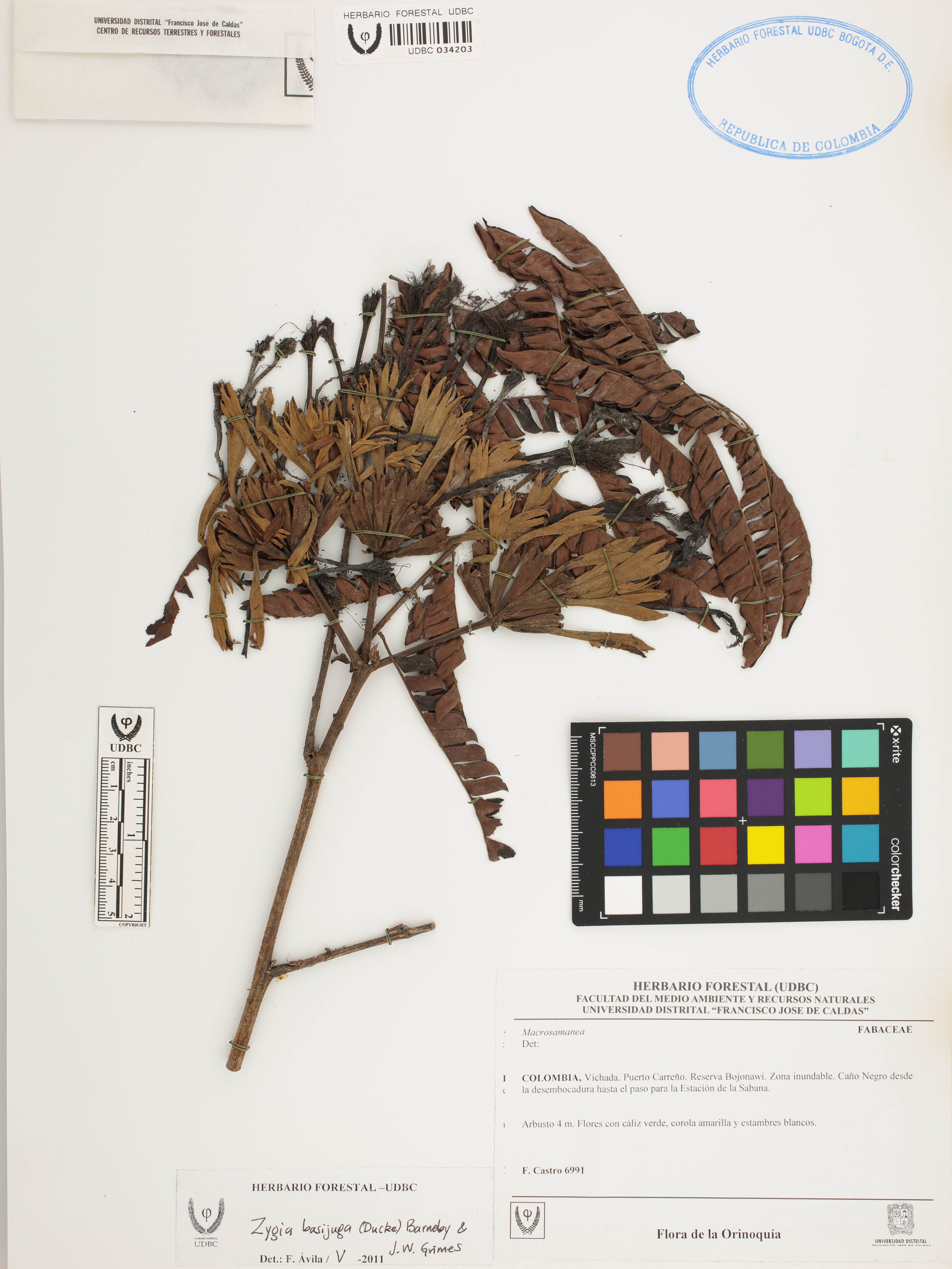 Fotografía del ejemplar Castro, F. 6991, determinado como Zygia basijuga en el año 2011