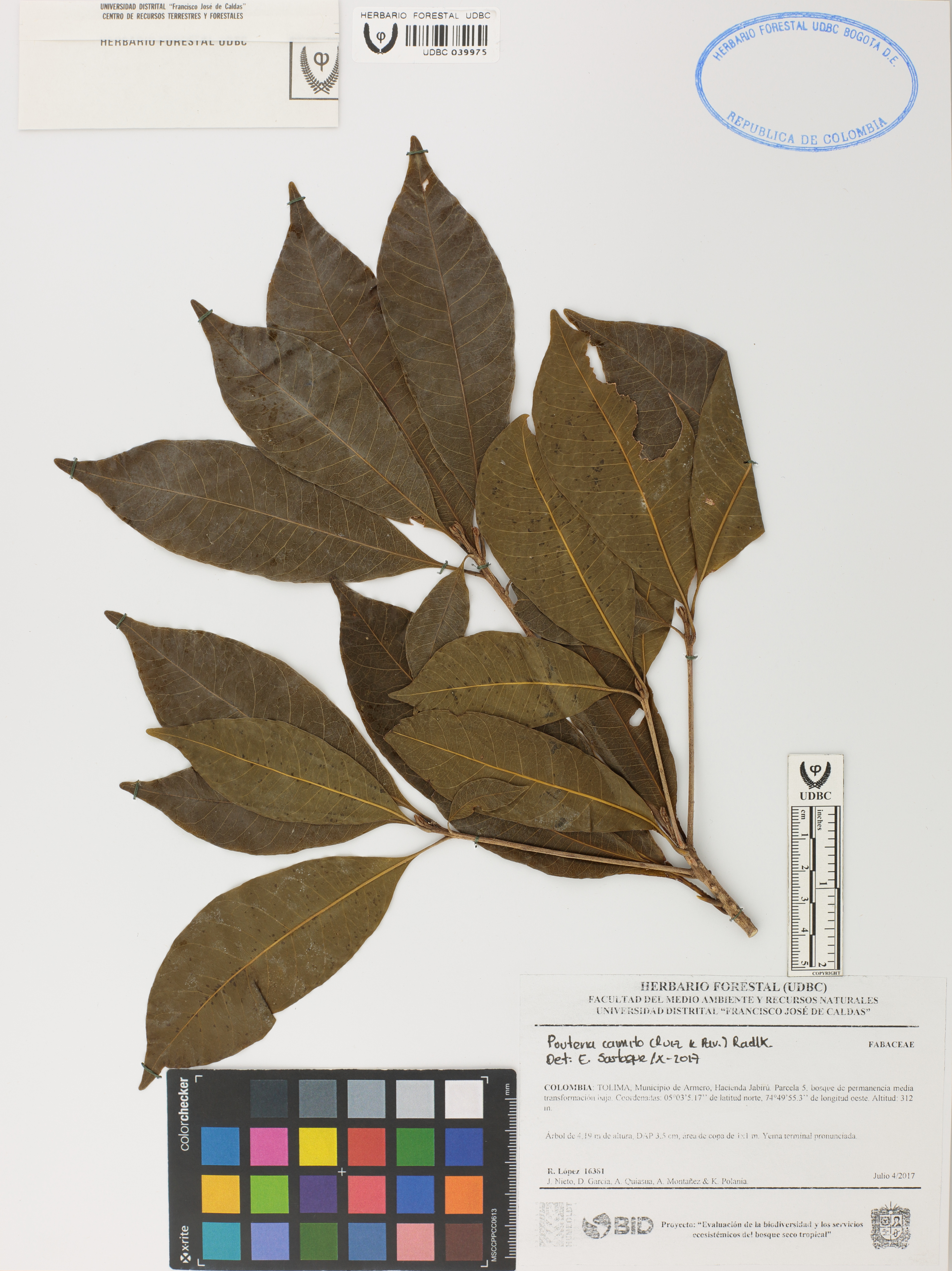Fotografía del ejemplar López, R. 16381, determinado como Pouteria caimito en el año 2017