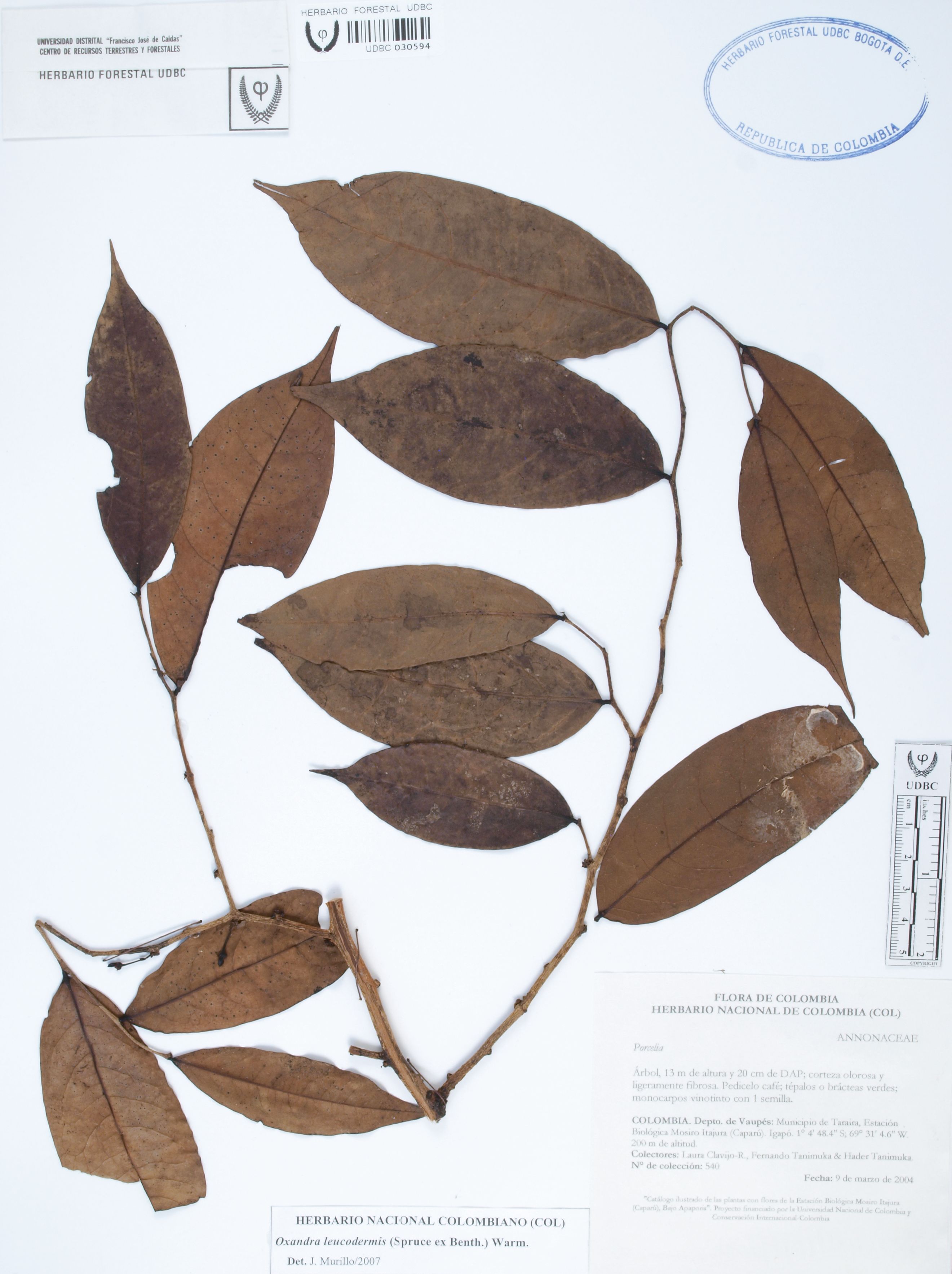 | dc.description | Fotografía del ejemplar Clavijo-R., L. 540, determinado como Oxandra leucodermis en el año 2007 | |