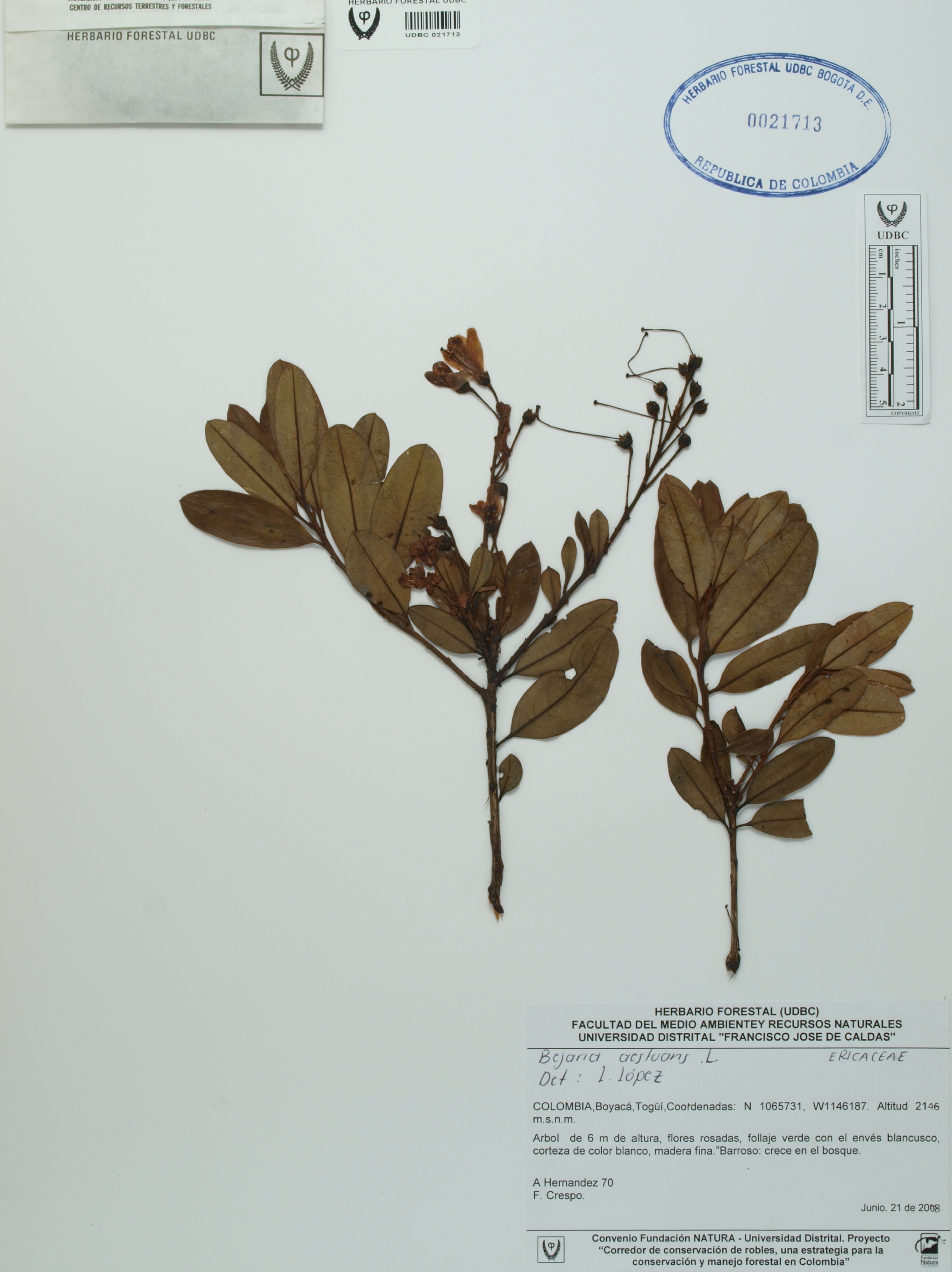 Fotografía del ejemplar Hernández, A. 70, determinado como Bejaria aestuans