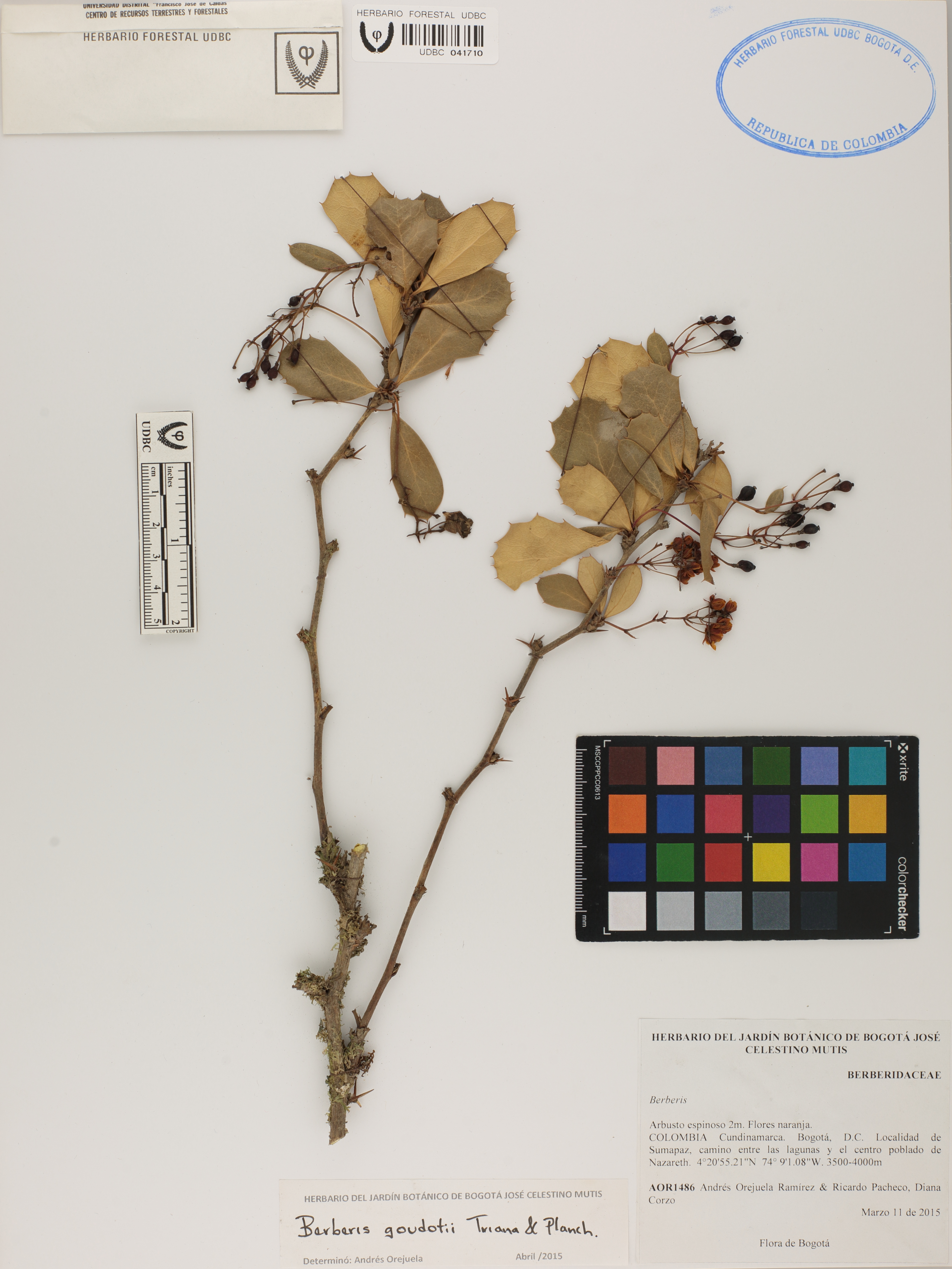 Fotografía del ejemplar Orejuela, A. 1486, determinado como Berberis goudotii en el año 2015