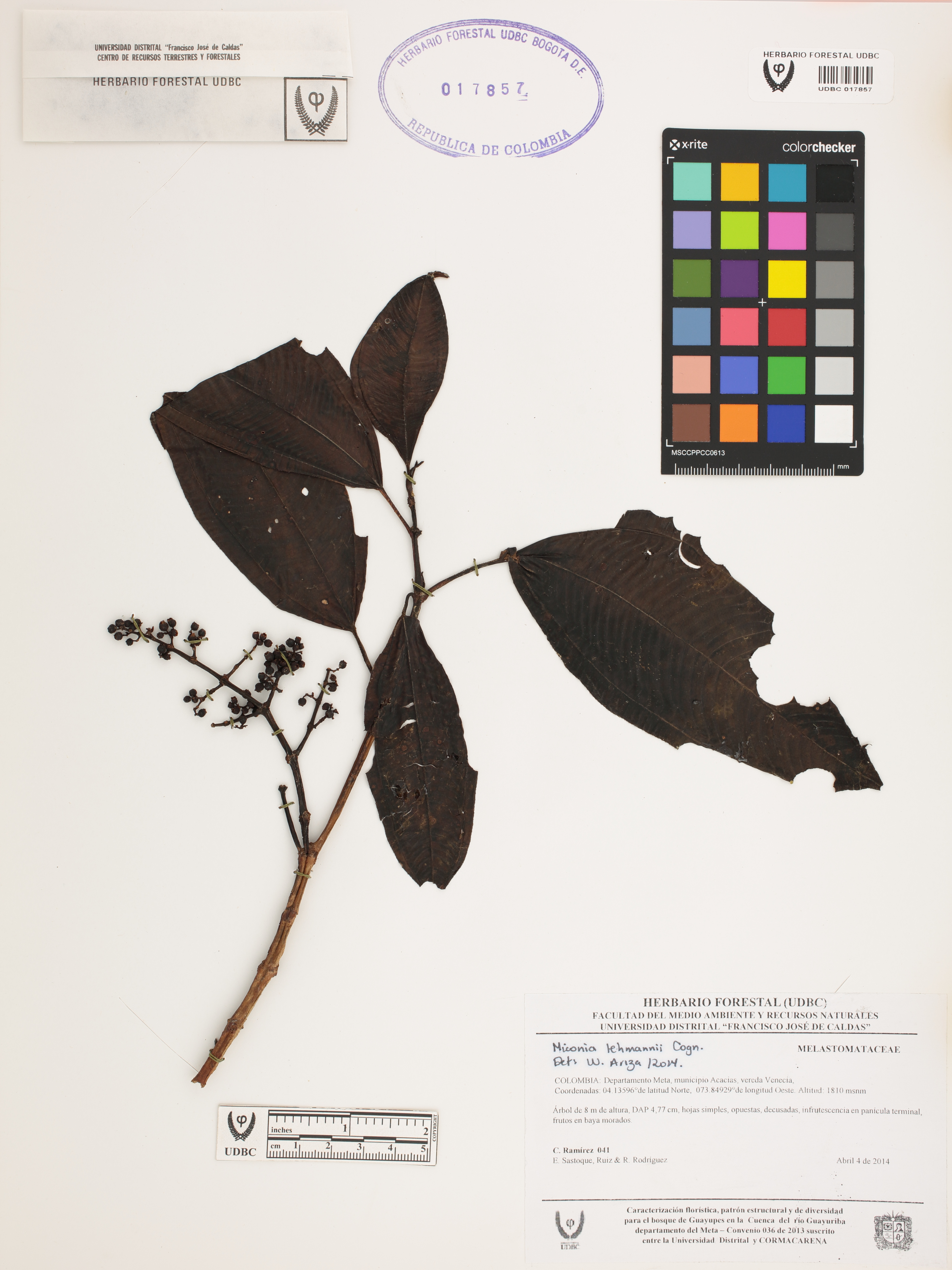 Fotografía del ejemplar Ramírez, C. 41, determinado como Miconia lehmannii en el año 2014