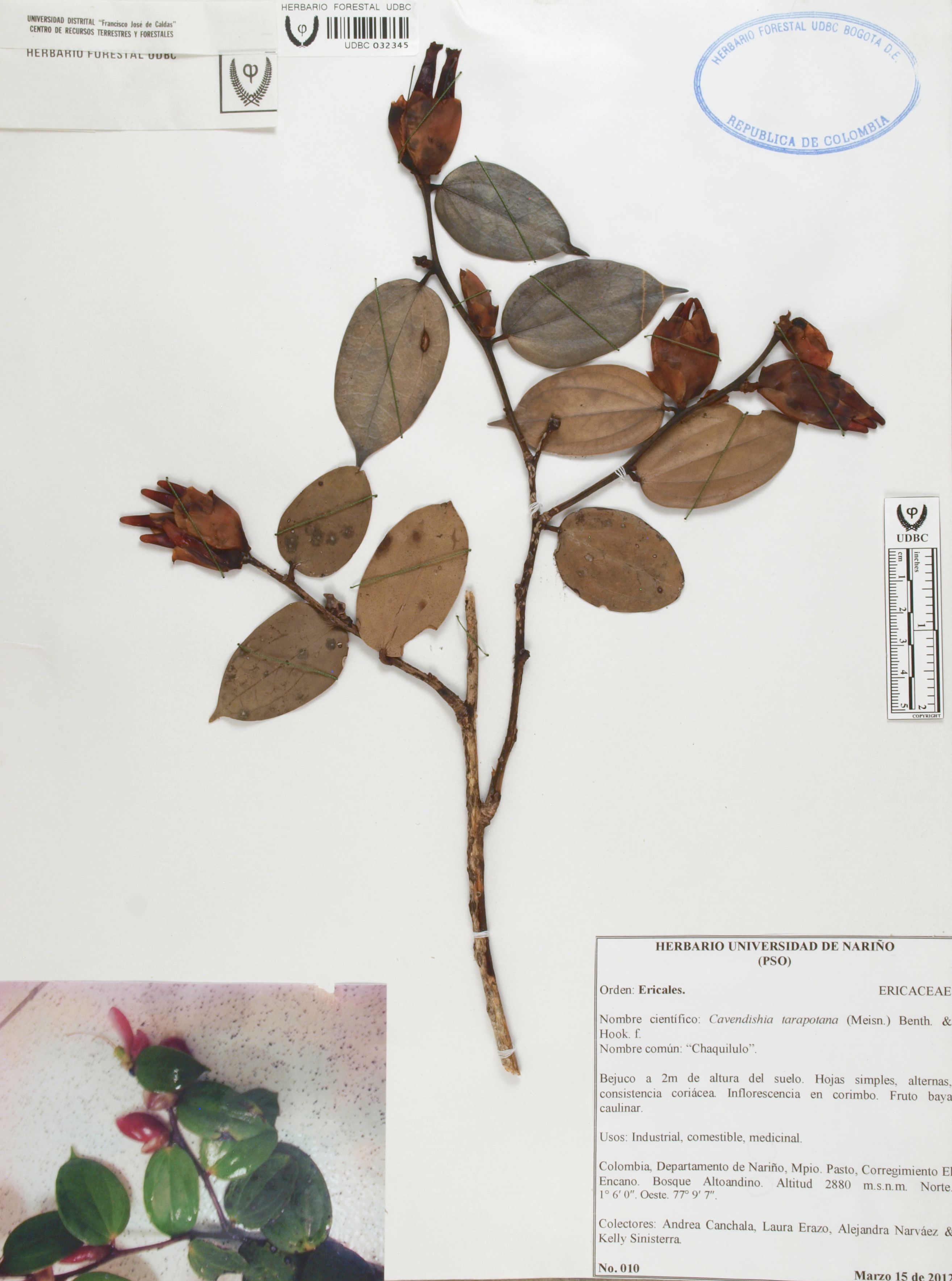 Fotografía del ejemplar Canchala, A. 10, determinado como Cavendishia tarapotana