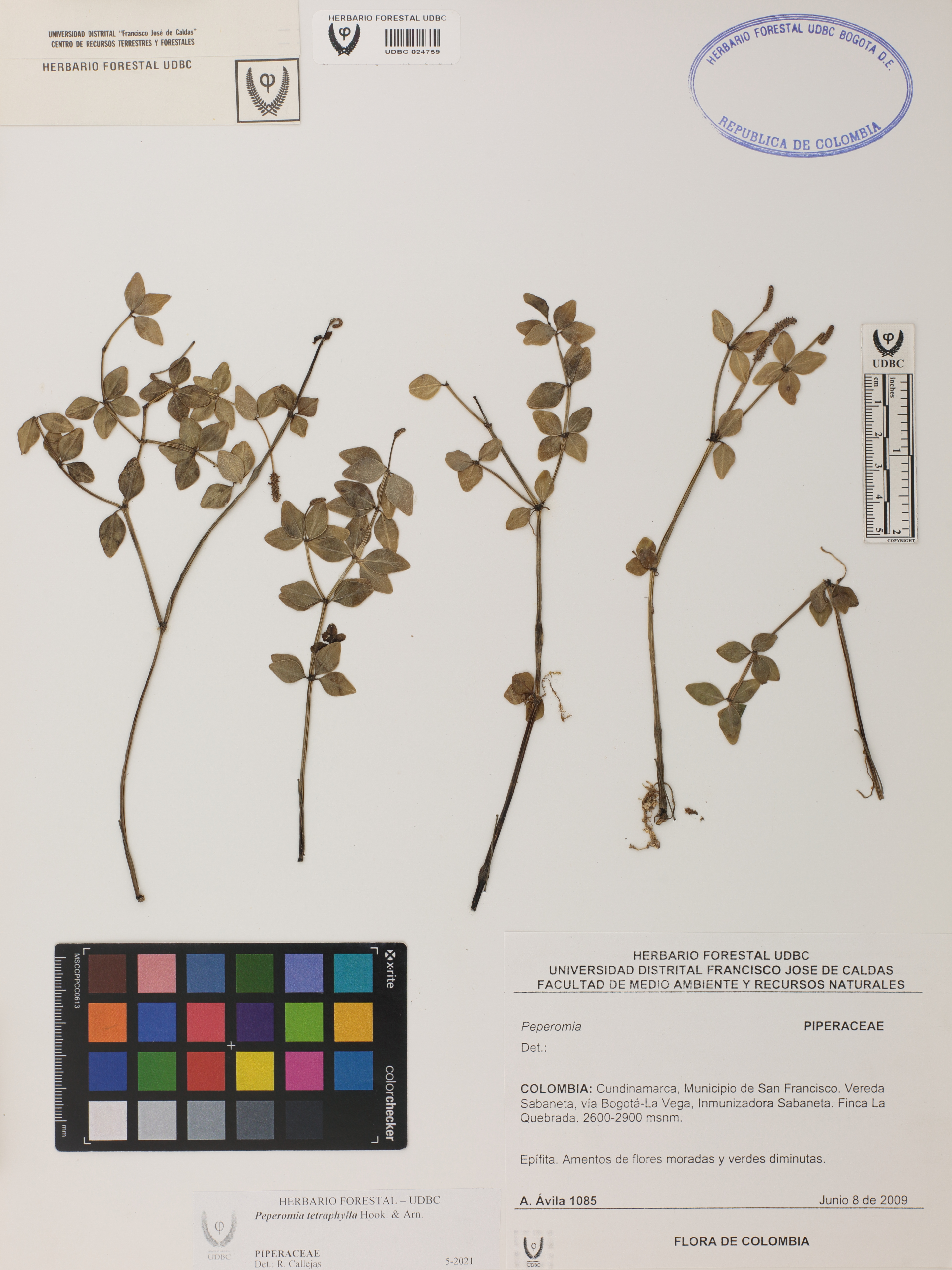 Fotografía del ejemplar Ávila, A. 1085, determinado como Peperomia tetraphylla en el año 2021