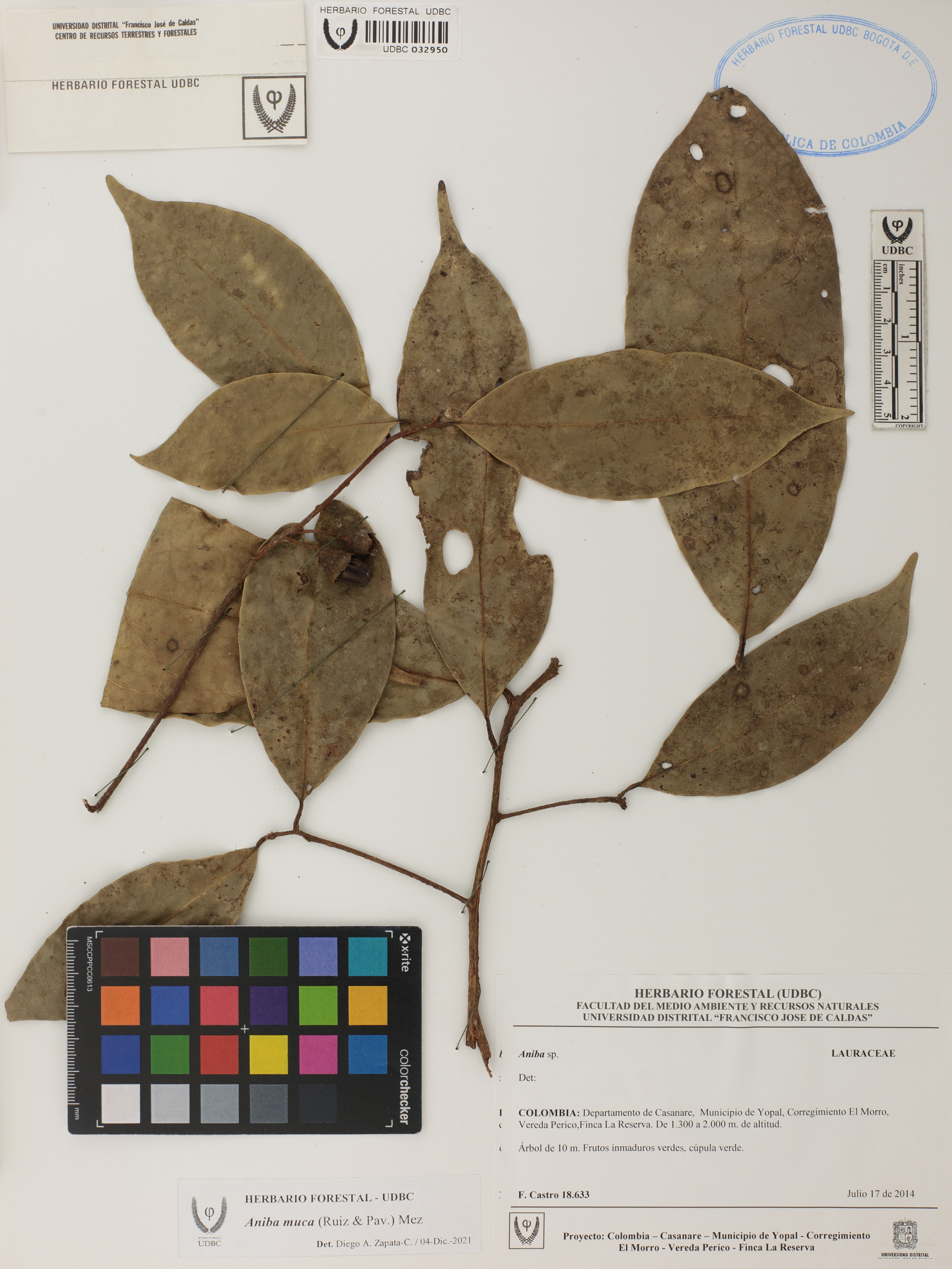 Fotografía del ejemplar Castro, F. 18633, determinado como Aniba muca en el año 2021
