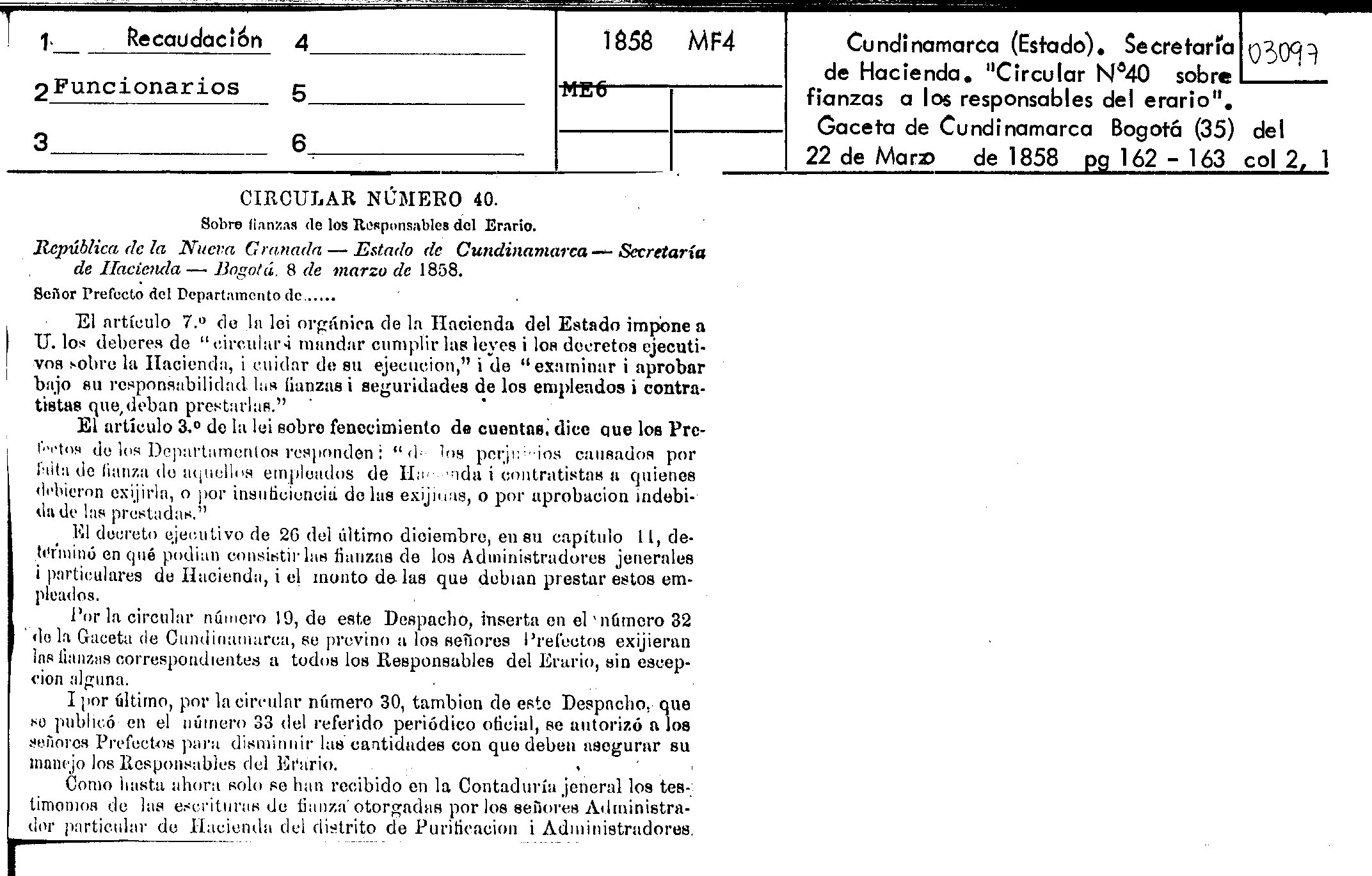 In summary, these provisions address aspects related to the collection of taxes, the management of public funds, the guarantee of responsibilities and the administration of State assets, establishing specific procedures and rates for each case. News Published in Gaceta de Cundinamarca on March 22, 1858