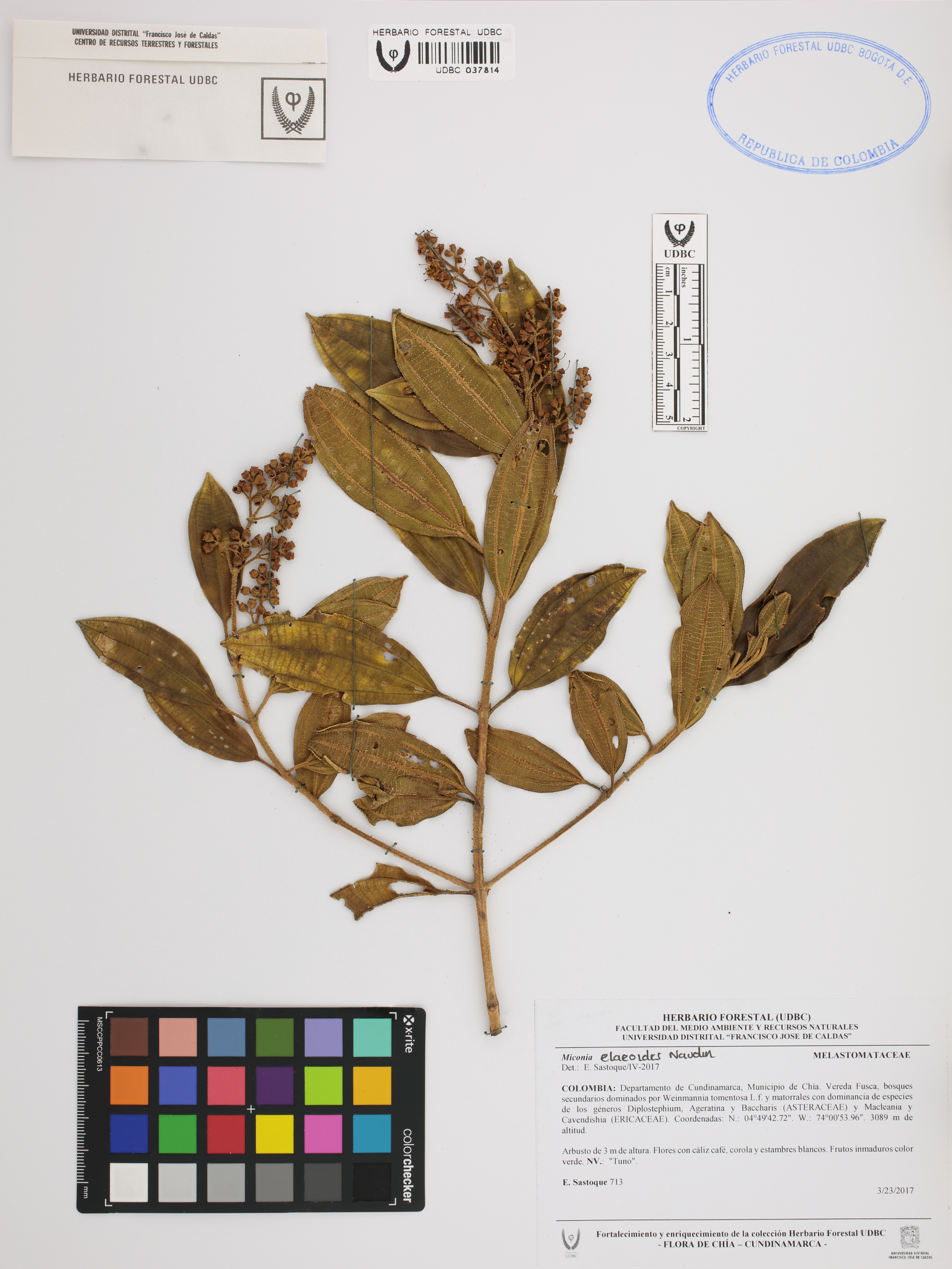 Fotografía del ejemplar Sastoque, E. 713, determinado como Miconia elaeoides en el año 2017