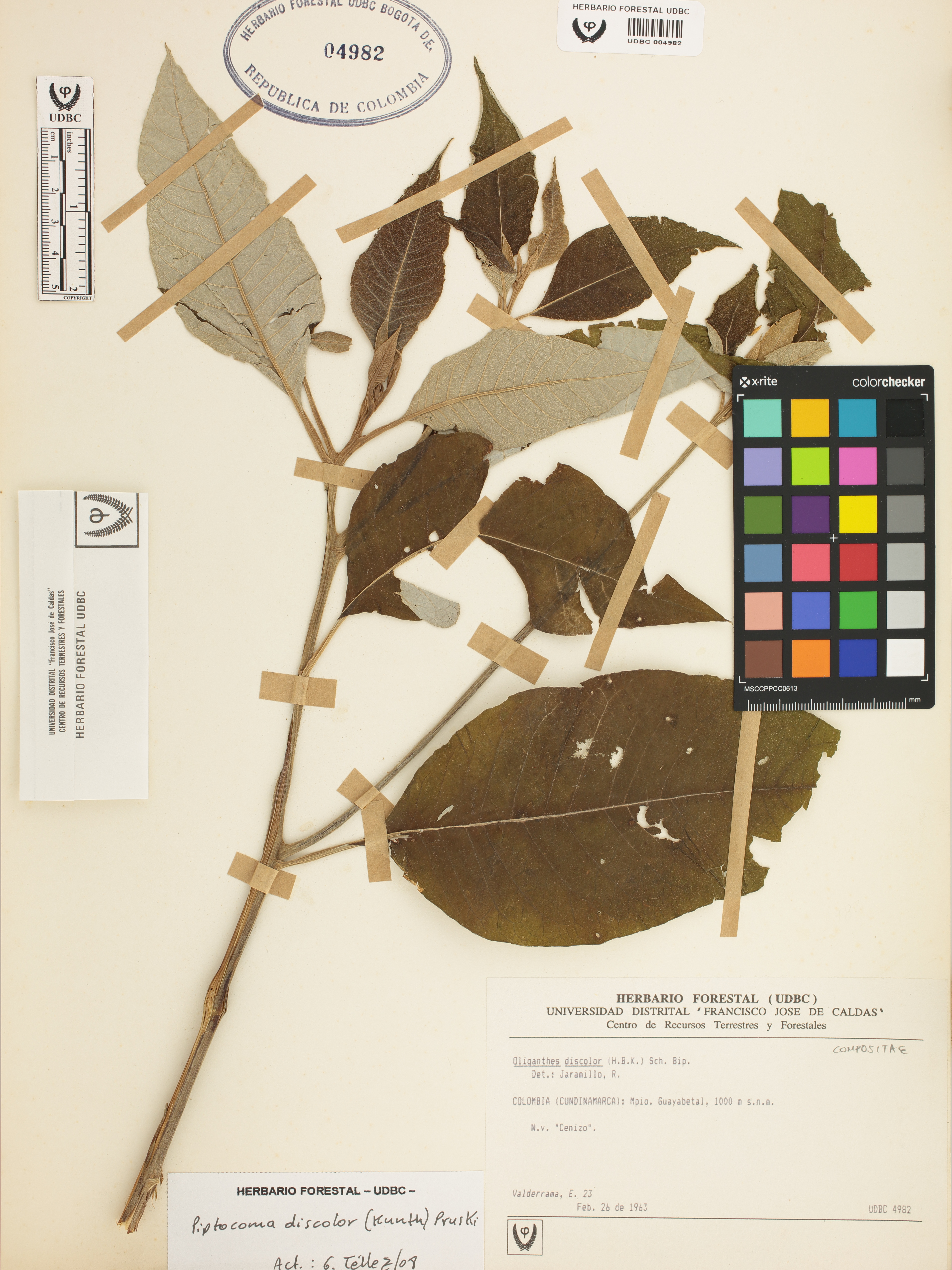 Fotografía del ejemplar Valderrama, E. 23, determinado como Piptocoma discolor en el año 2008