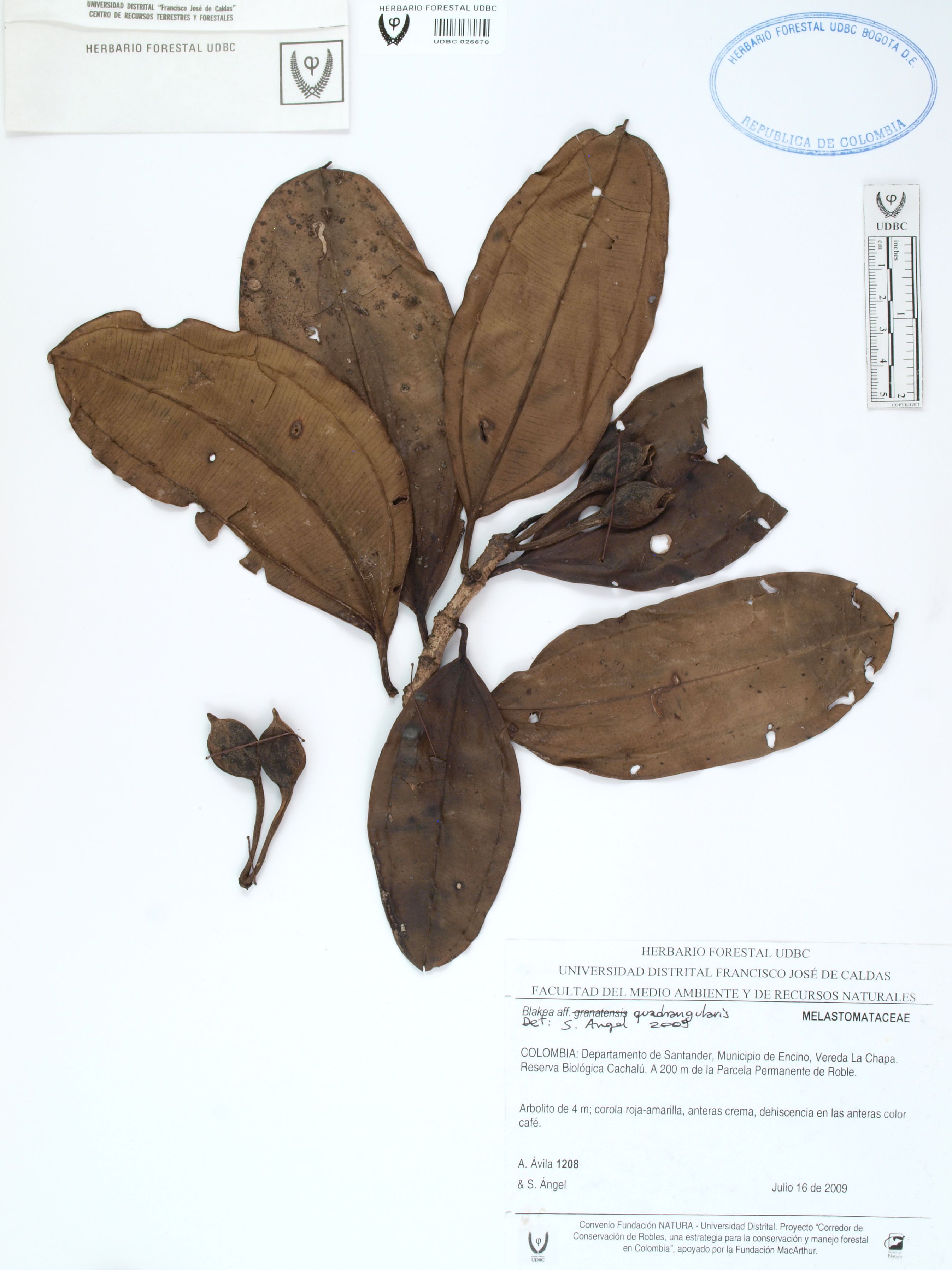 Fotografía del ejemplar Ávila, F. 1208, determinado como Blakea quadrangularis en el año 2009