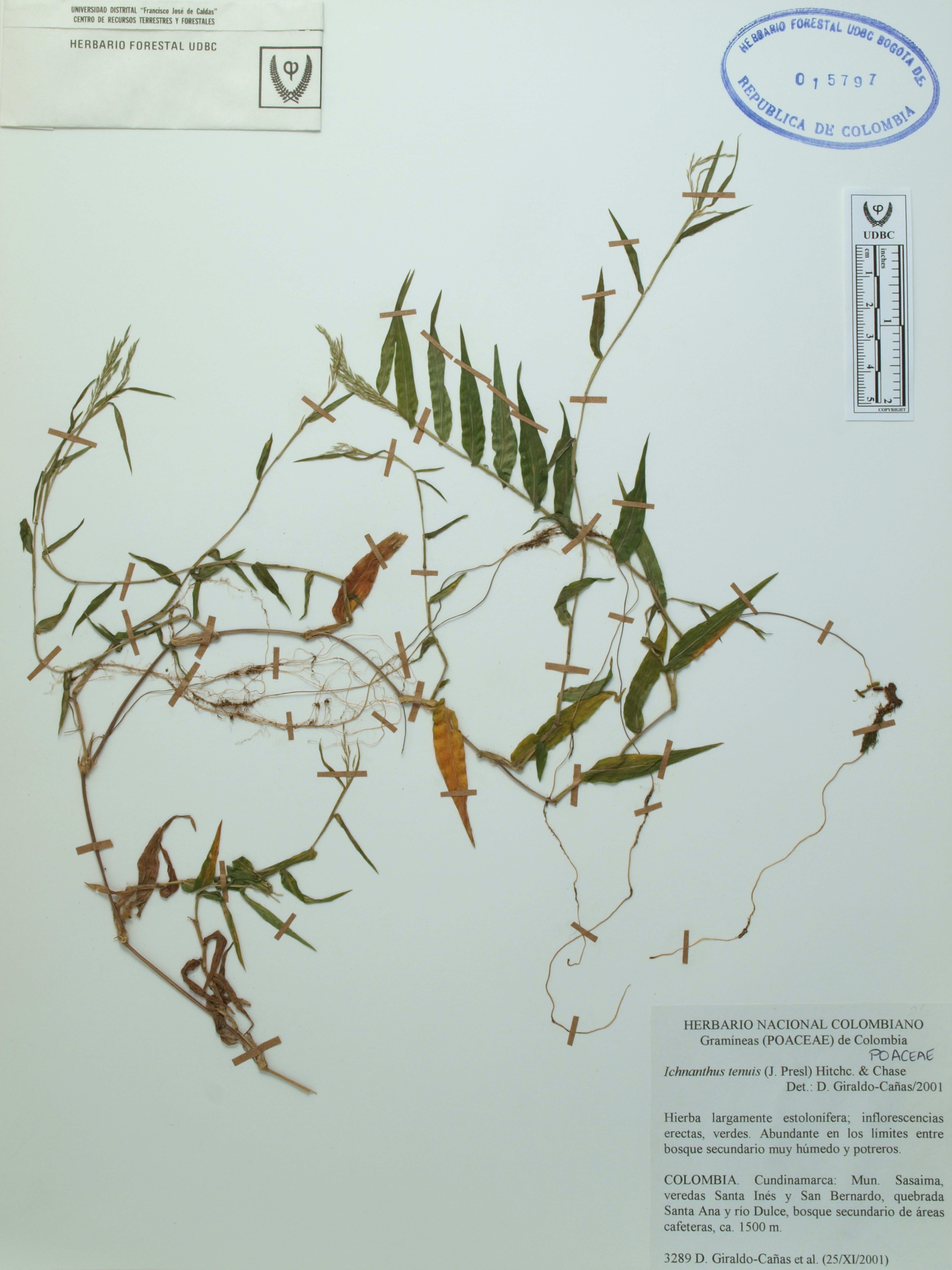 Fotografía del ejemplar Giraldo-Cañas, D. 3289, determinado como Ichnanthus tenuis en el año 2001