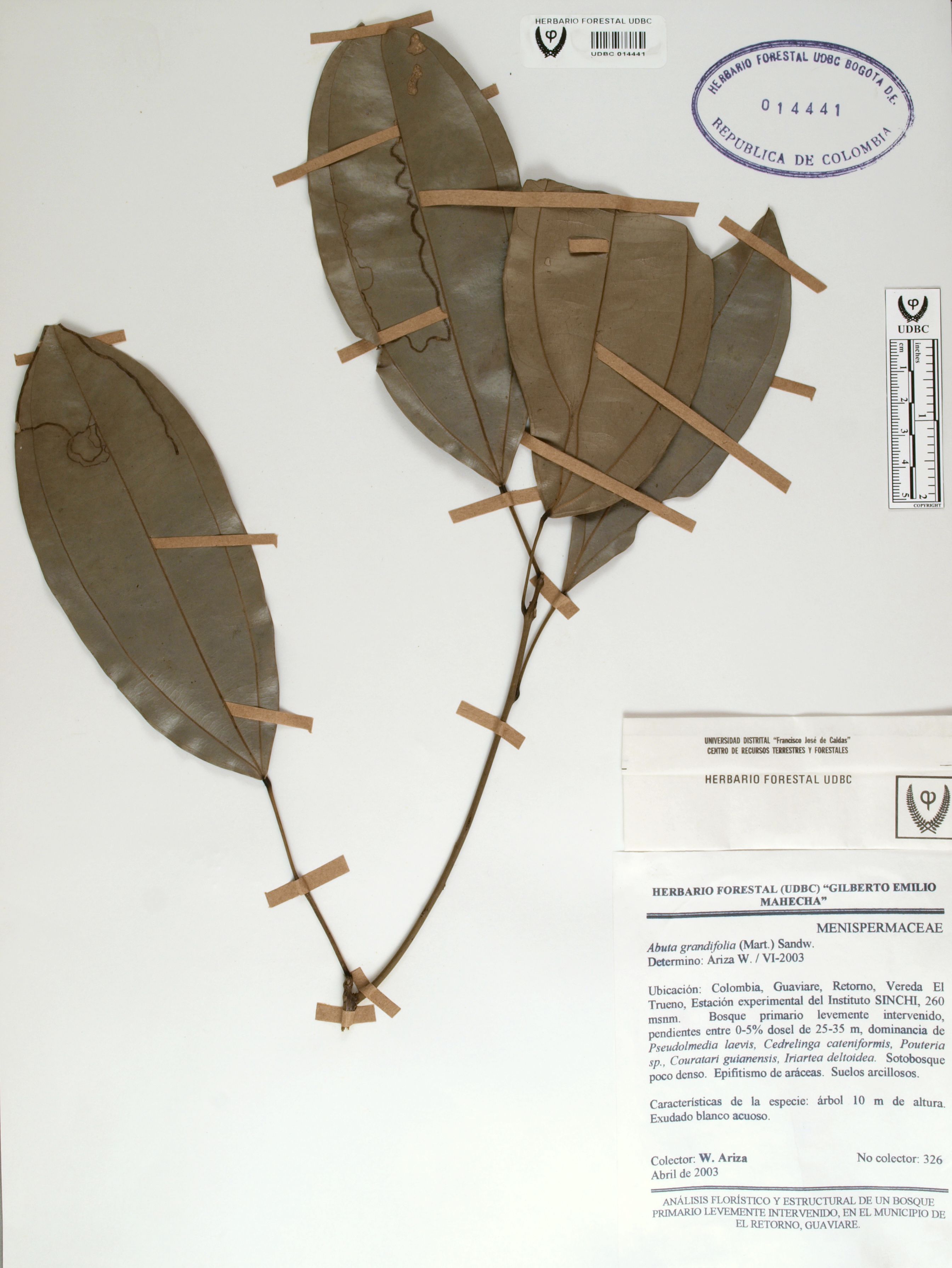 Fotografía del ejemplar Ariza, W. 326, determinado como Abuta grandifolia en el año 2003