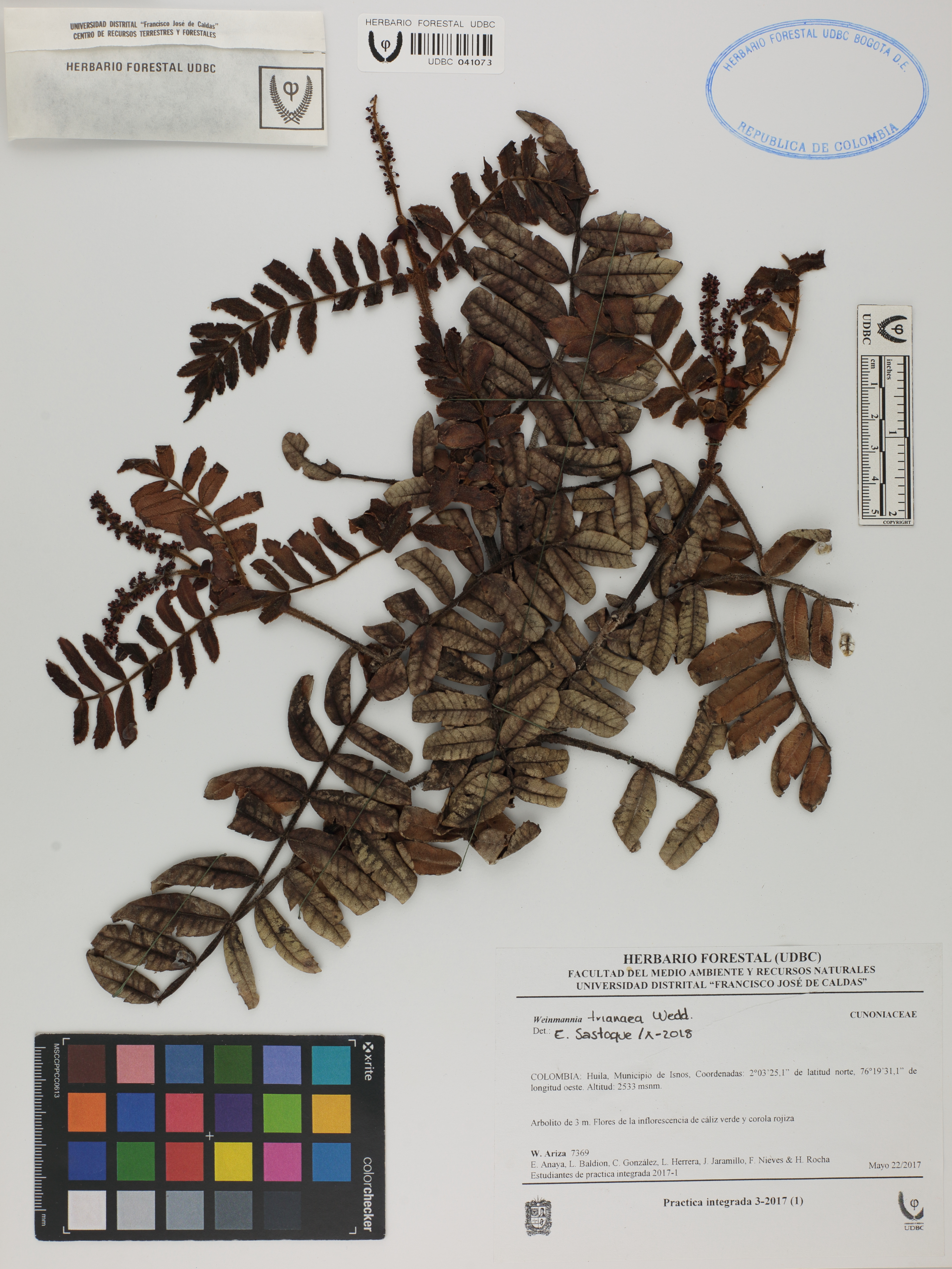 Fotografía del ejemplar Ariza, W. 7369, determinado como Weinmannia trianaea en el año 2018