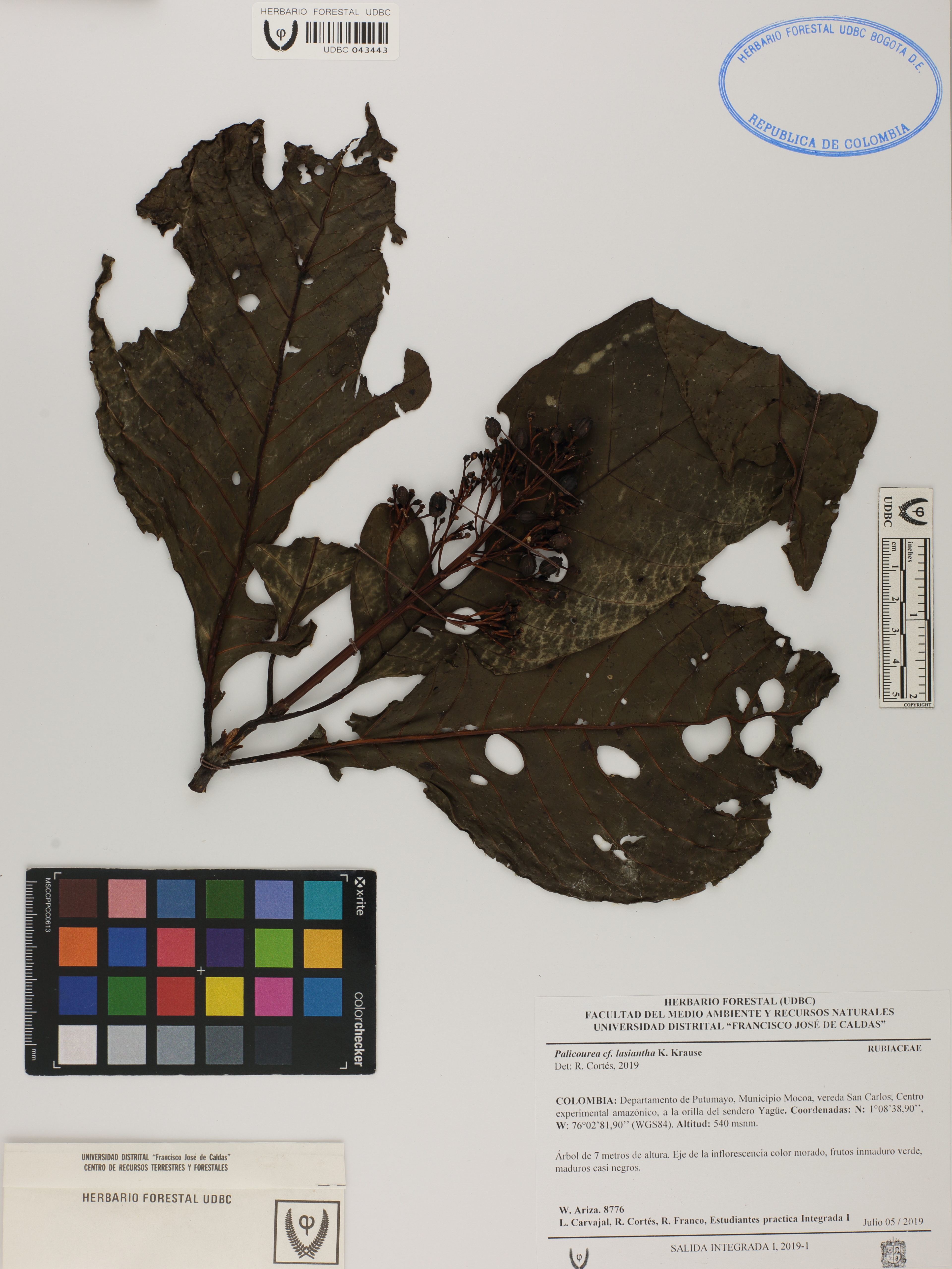 Fotografía del ejemplar Ariza, W. 8776, determinado como Palicourea lasiantha en el año 2019