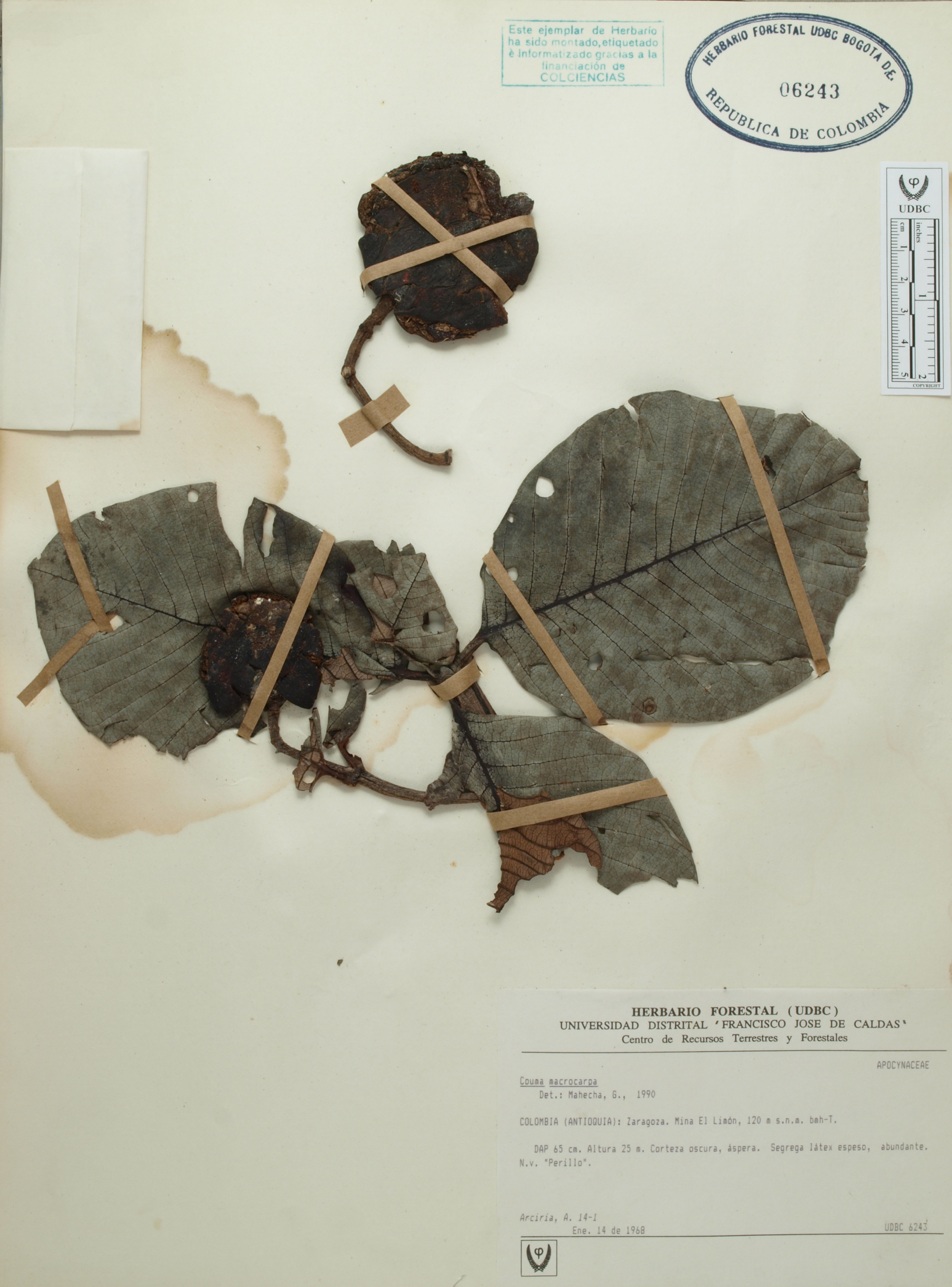 Fotografía del ejemplar Arciria, A. 14, determinado como Couma macrocarpa en el año 1990