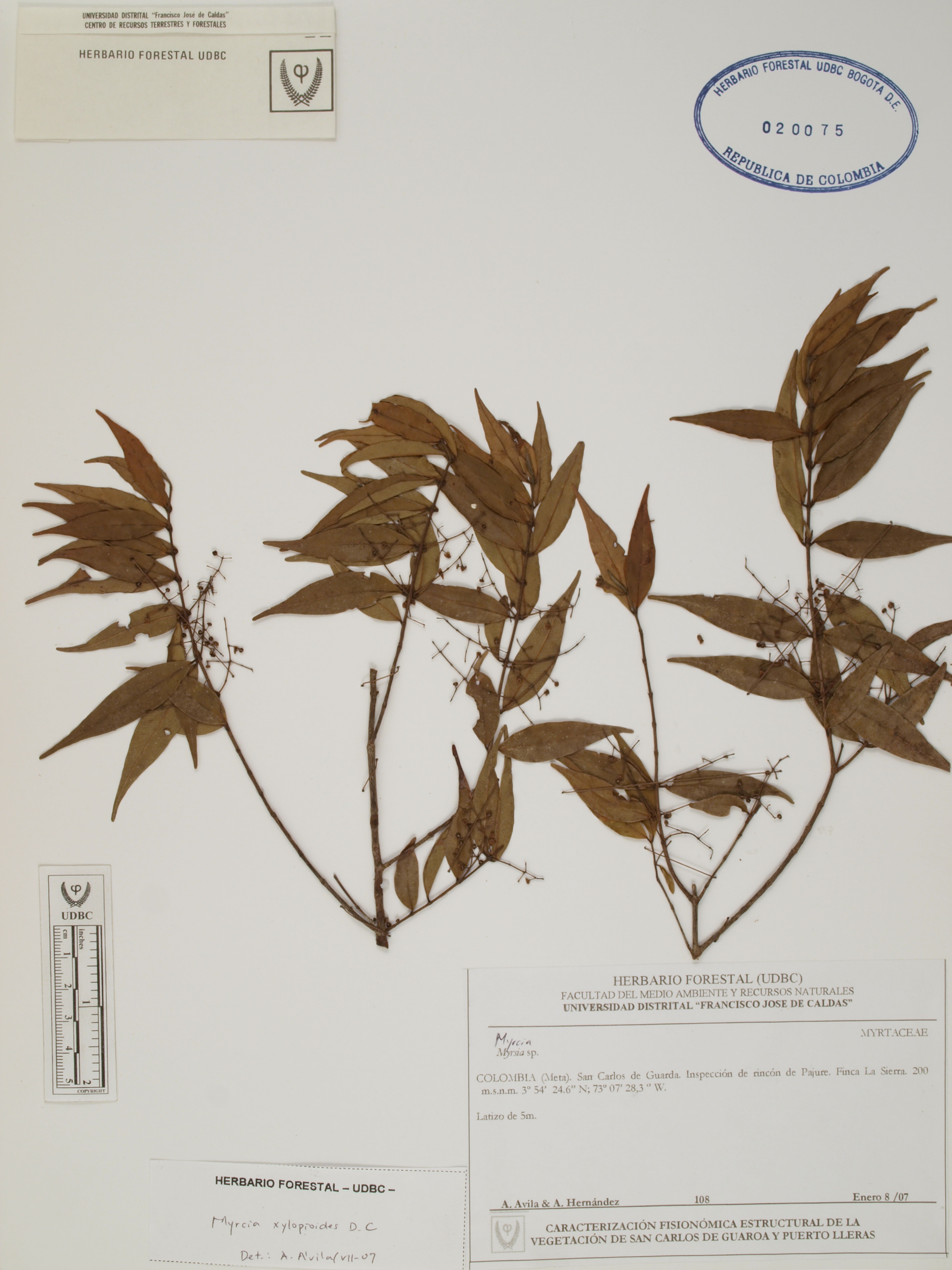 Fotografía del ejemplar Ávila, F. 108, determinado como Myrcia xylopioides en el año 2007